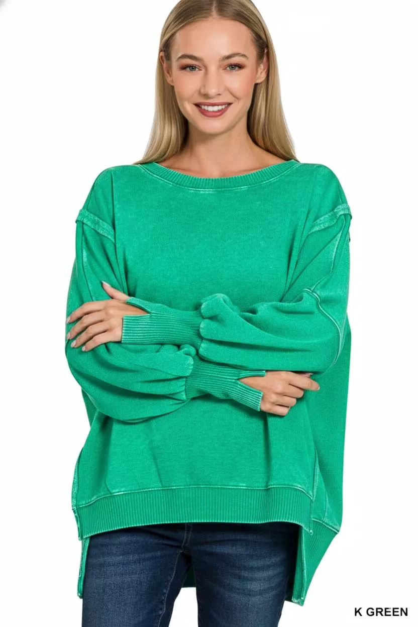 Zenana Acid Washed Batwing Sleeve Fleece Sweatshirt