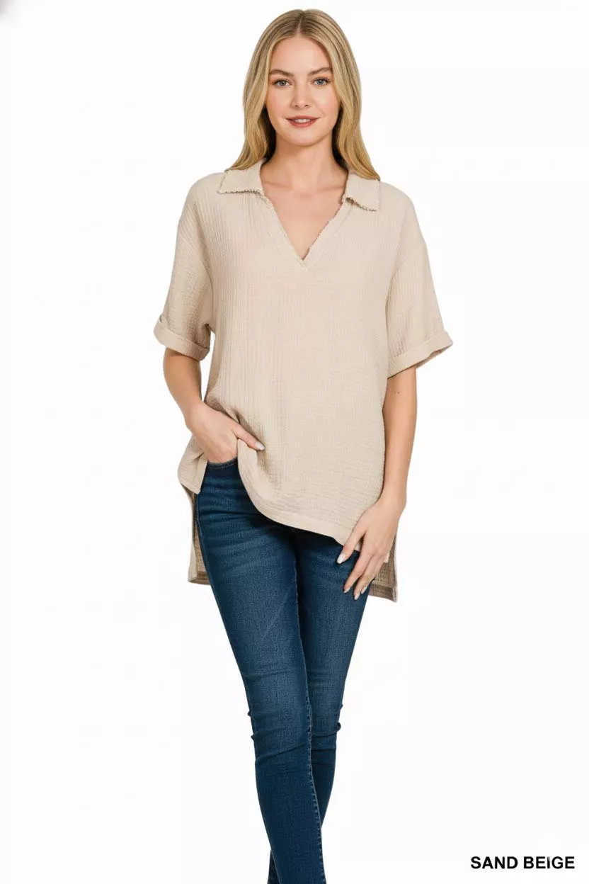 Introducing the Double Gauze Short Sleeve High-Low Top, a breezy and stylish piece perfect for warm-weather days. This top features a lightweight double gauze fabric that is both comfortable and breathable. The modern high-low hem adds a touch of flair to the classic short sleeve design. Versatile and easy to style, this top can be dressed up or down for any occasion. Stay cool and chic all season long with the fashionable Double Gauze Short Sleeve High-Low Top!