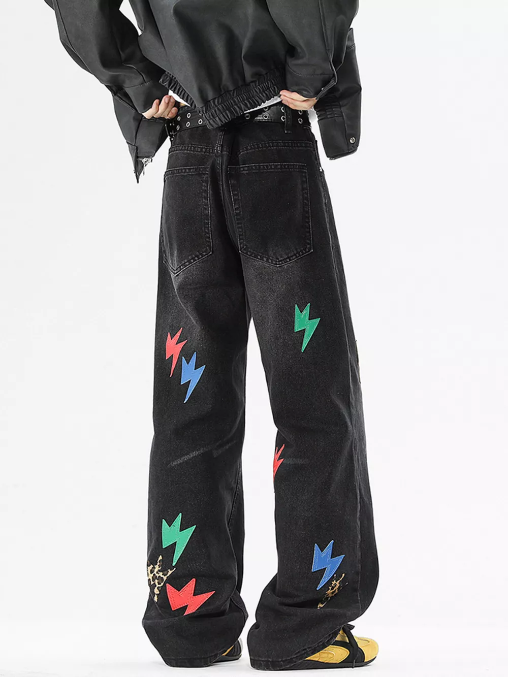 Men's Full Size Lightning Bolt Print Wide Leg Jeans Plus Size