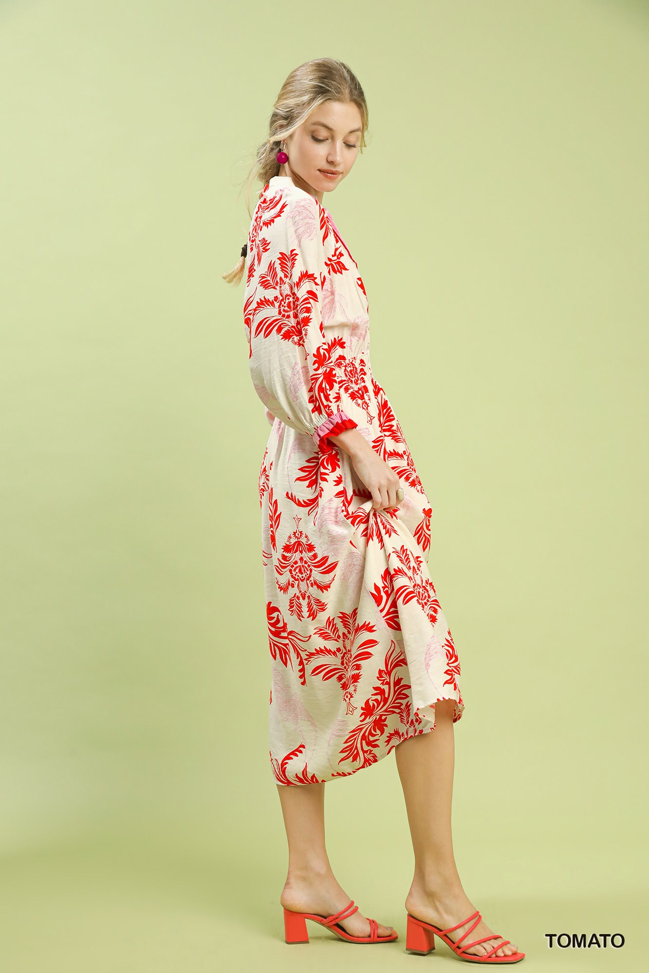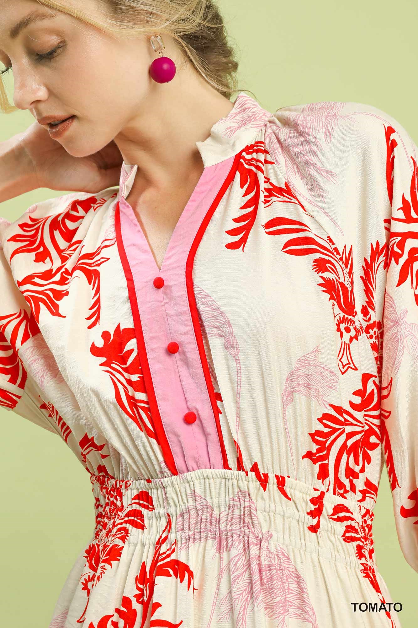 Introducing the Tropical Print Button Detail Midi Dress, a chic and feminine piece perfect for summer days. This dress features key details such as a contrast solid button placket and neckline, as well as ruffle-trim cuffs for added charm. The smocked elastic waistline creates a flattering silhouette, while the midi-length skirt flows beautifully with a tropical print. Lined for comfort and coverage, this dress is both stylish and practical. Elevate your summer wardrobe with this breezy and on-trend Tropical Print Button Detail Midi Dress!