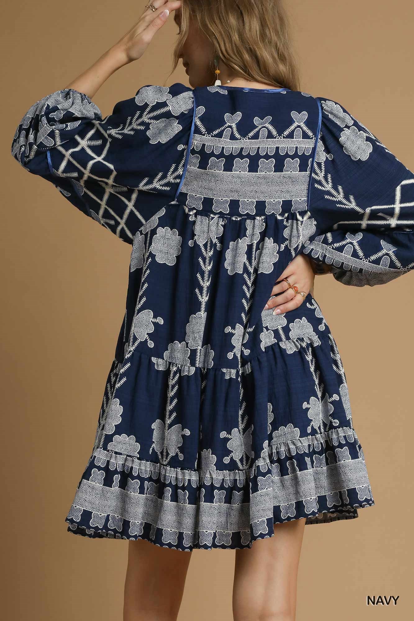 This tribal print dress features a stylish front tie-neck with ribbon detail, adding a charming touch to the design. The balloon sleeves with elastic cuffs offer a comfortable and on-trend look. The tiered hemline adds interesting dimension and movement to the dress. Please note that this dress is not lined, providing a lightweight and breezy feel perfect for warm weather. Overall, this dress is a chic choice for adding a bohemian flair to your wardrobe.