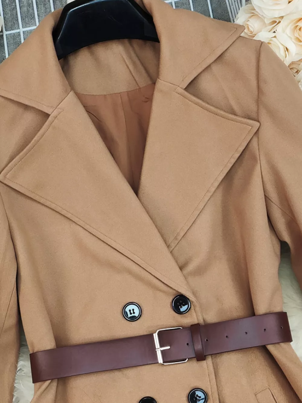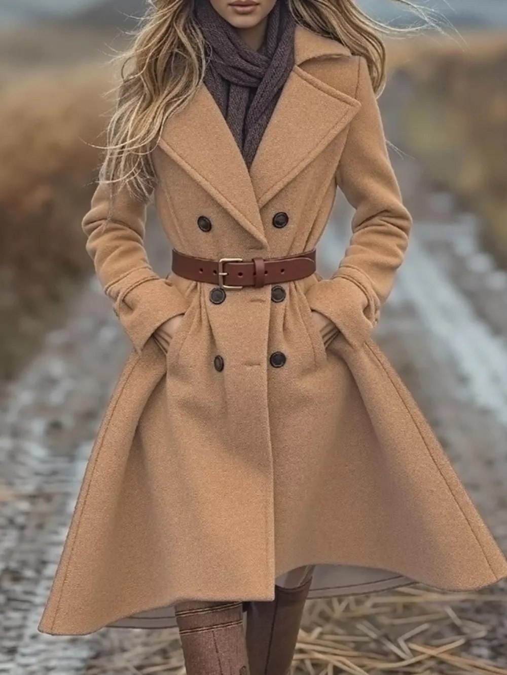 - Features:Pocketed,Double-breasted,Belted