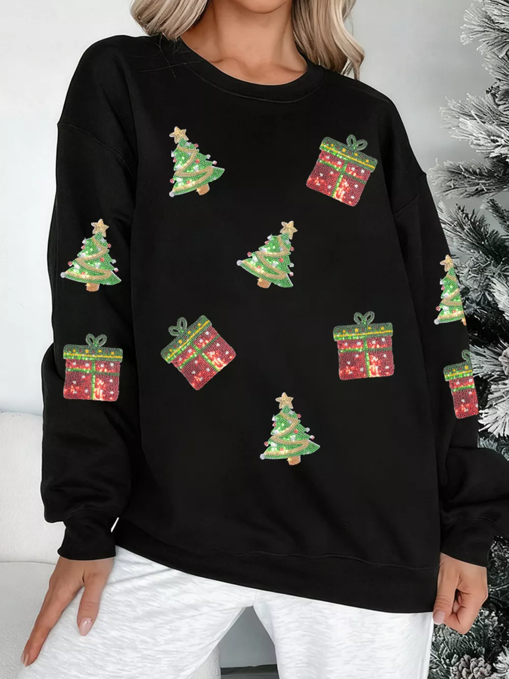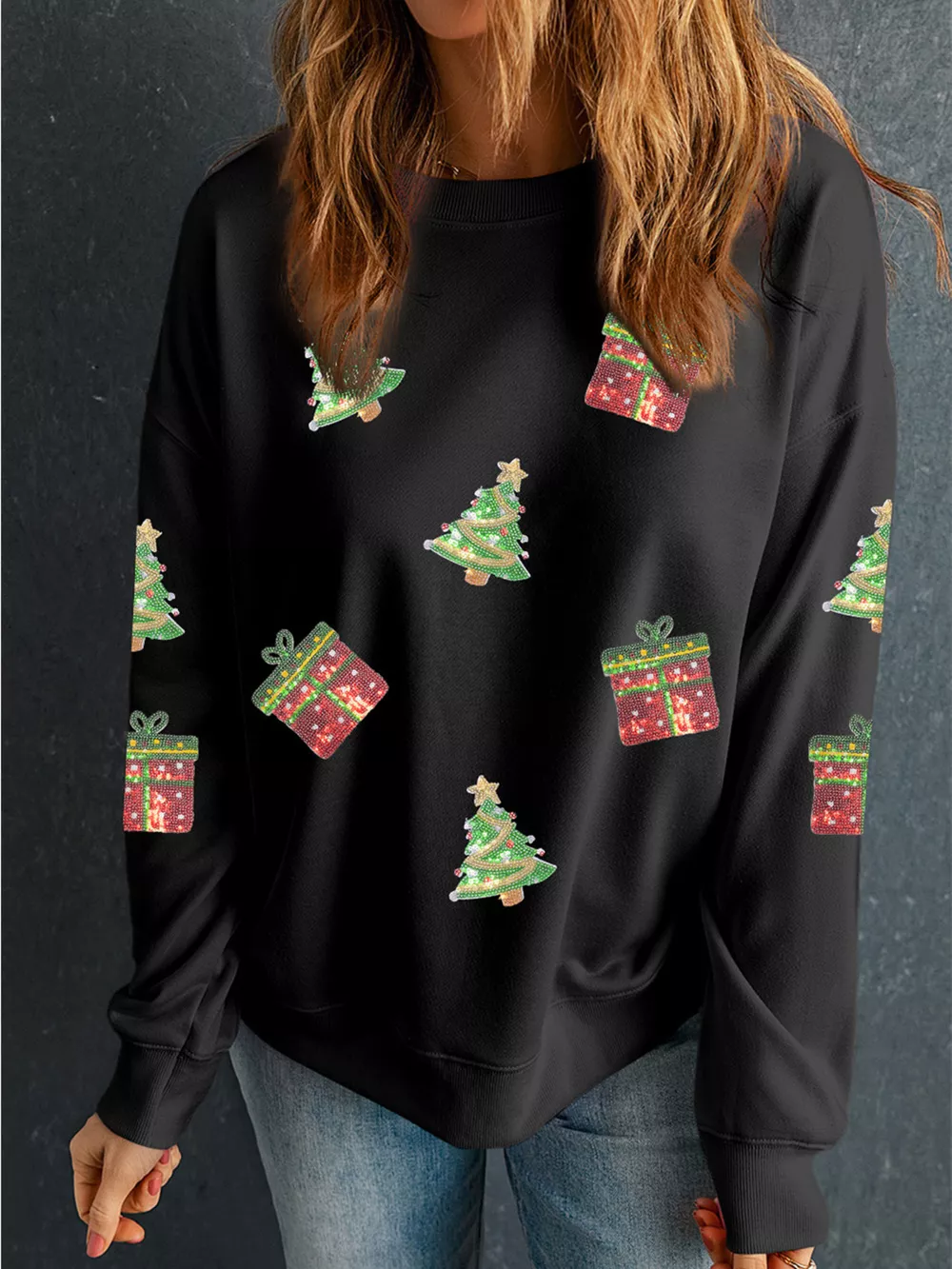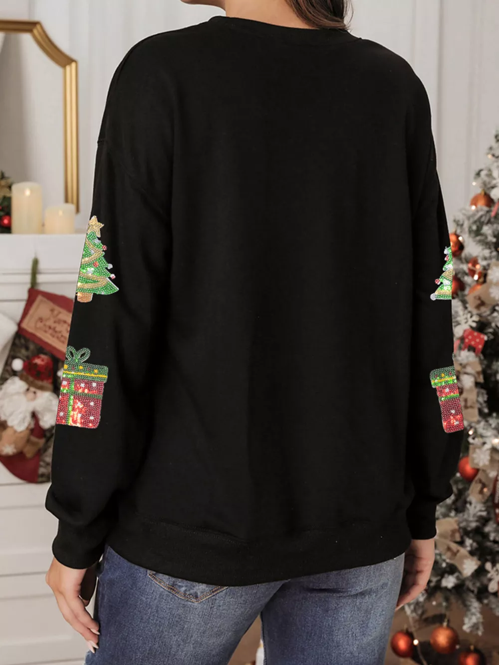 Sequin Christmas Trees Gifts Patched Drop Shoulder Sweatshirt