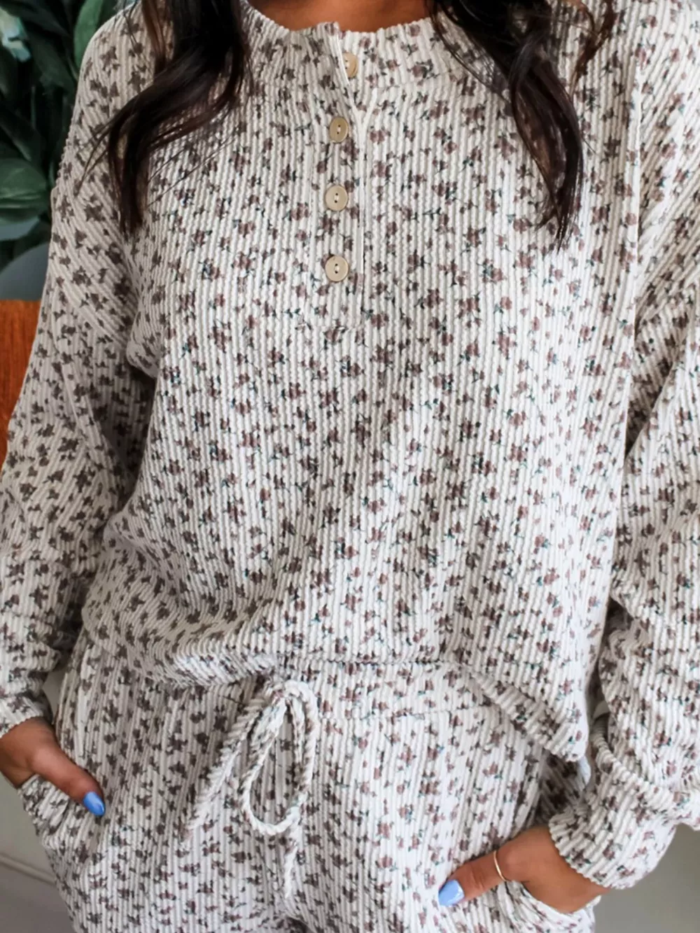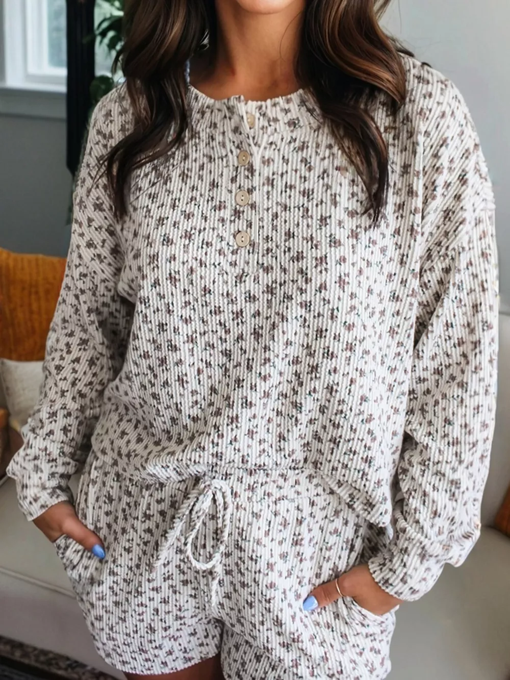 Spiral Ribbed Floral Print Long Sleeve Henley Top Drawstring Short Set