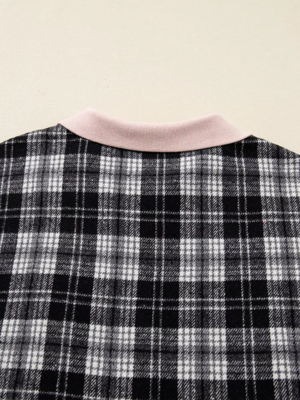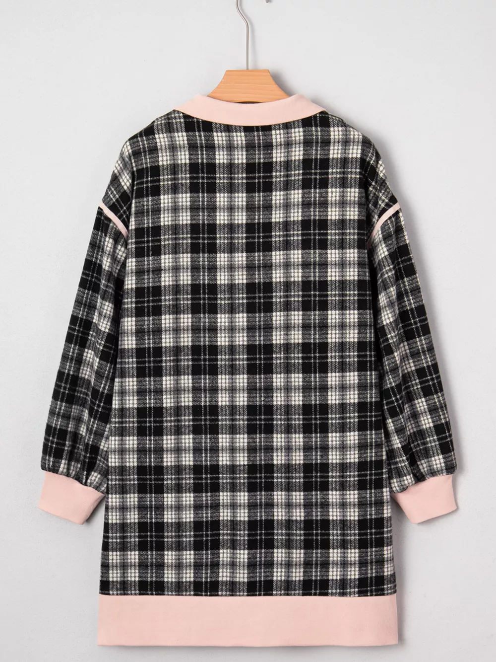Plaid Polo Collar Zip up Contrast Trim Shift Long Sleeve Mini Dress