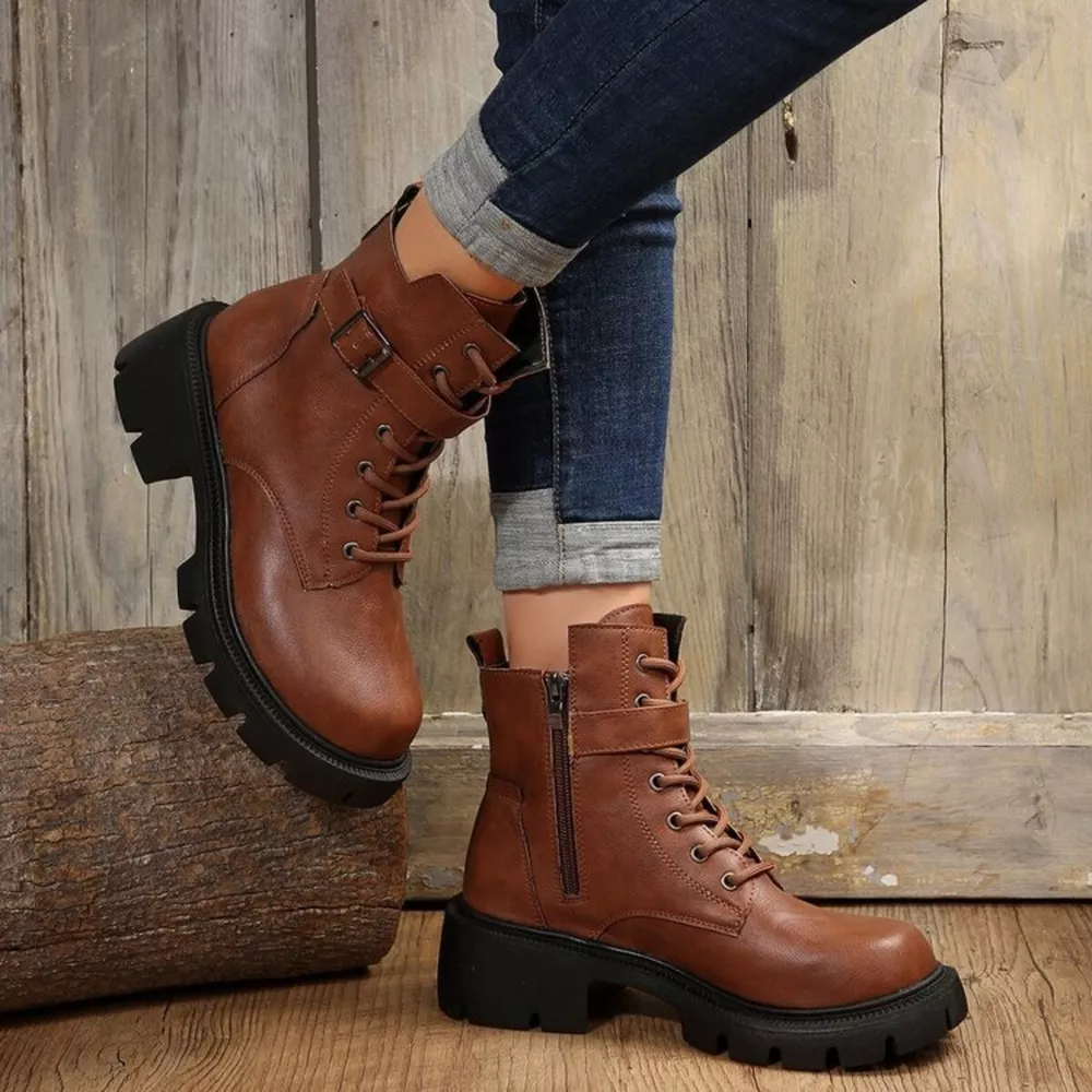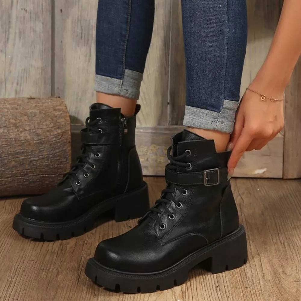 Lace-Up Buckle Accent Block Heel Boots