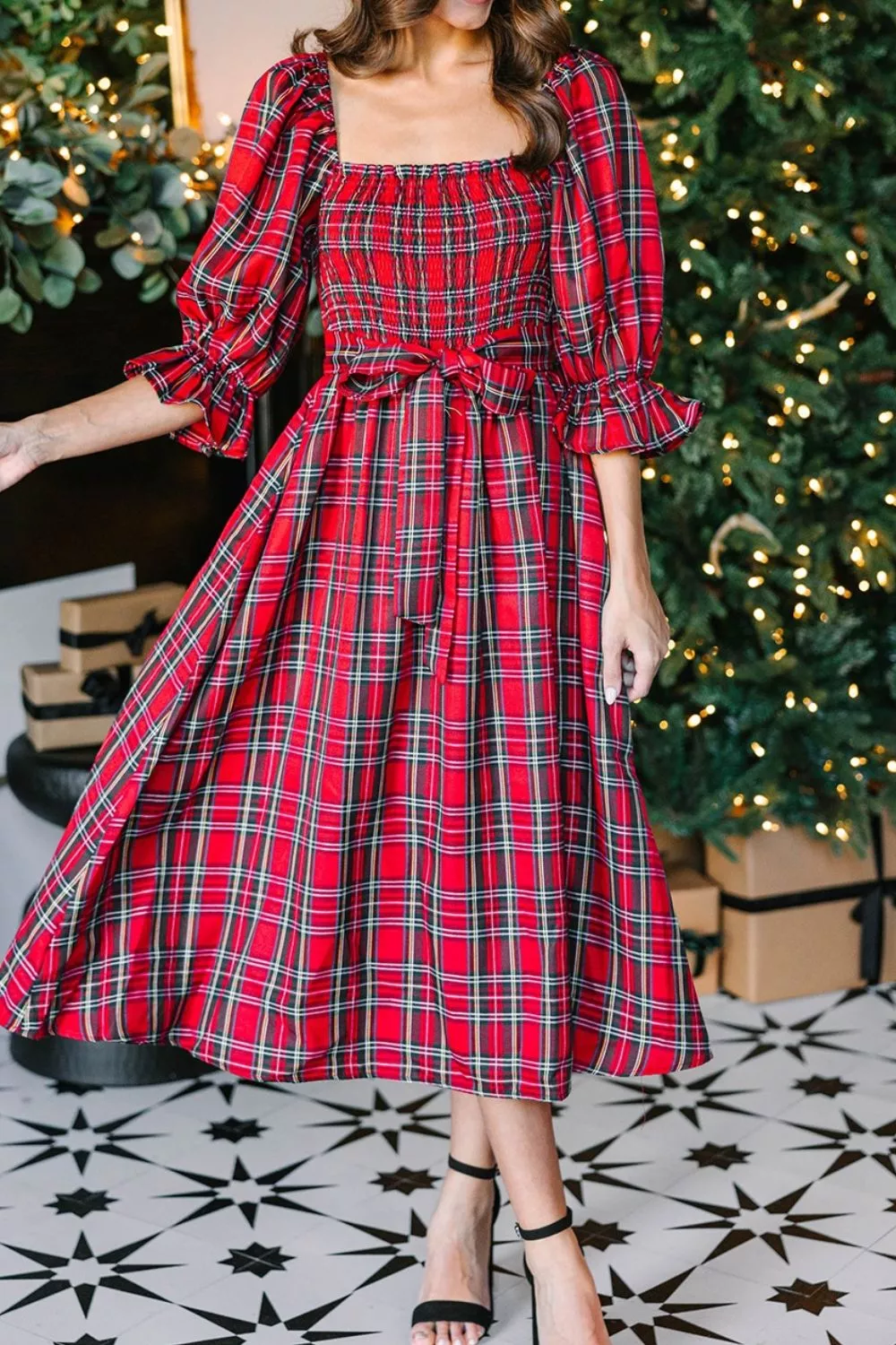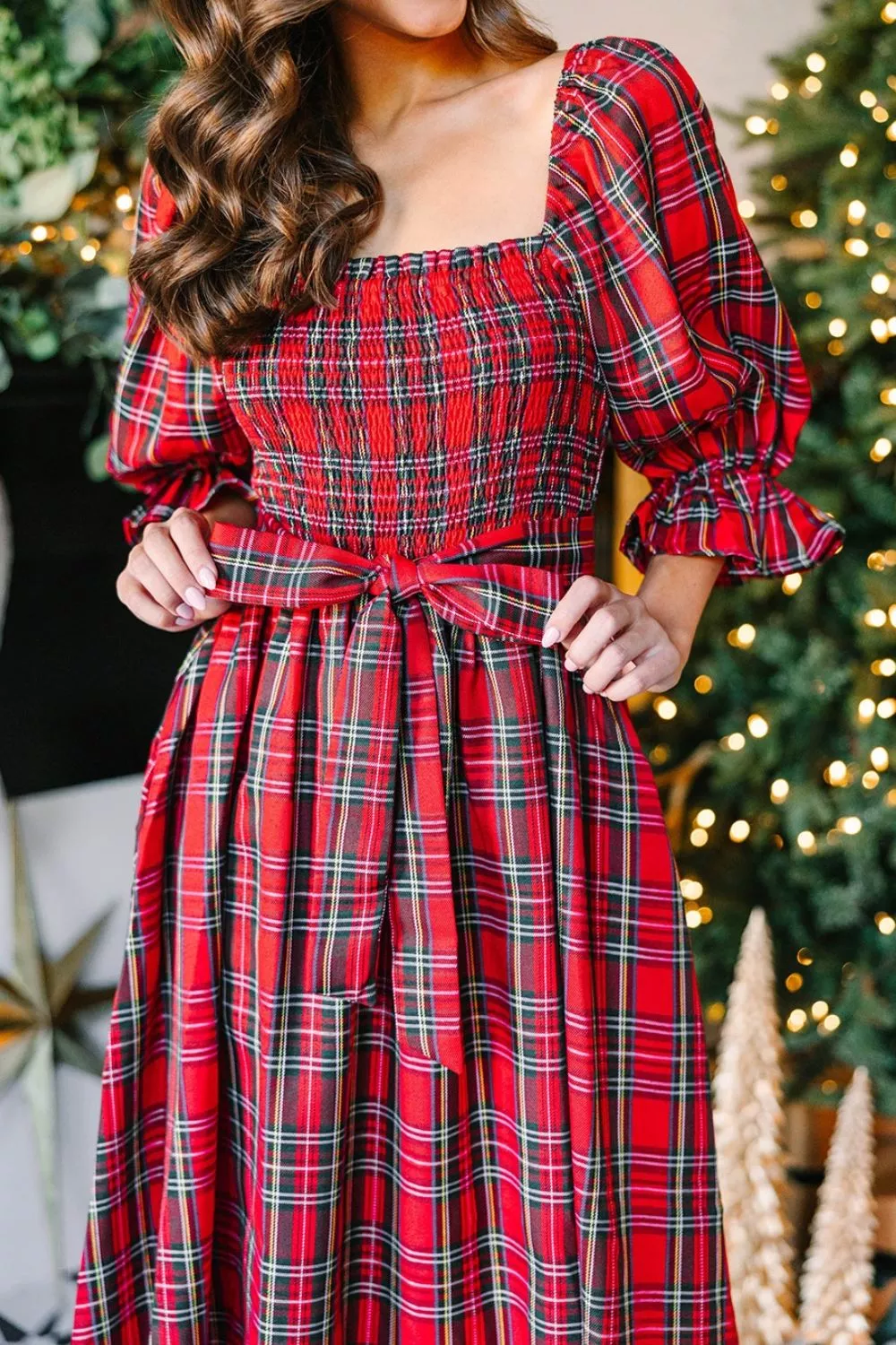 Plaid Smocked Flounce Sleeve Midi Dress