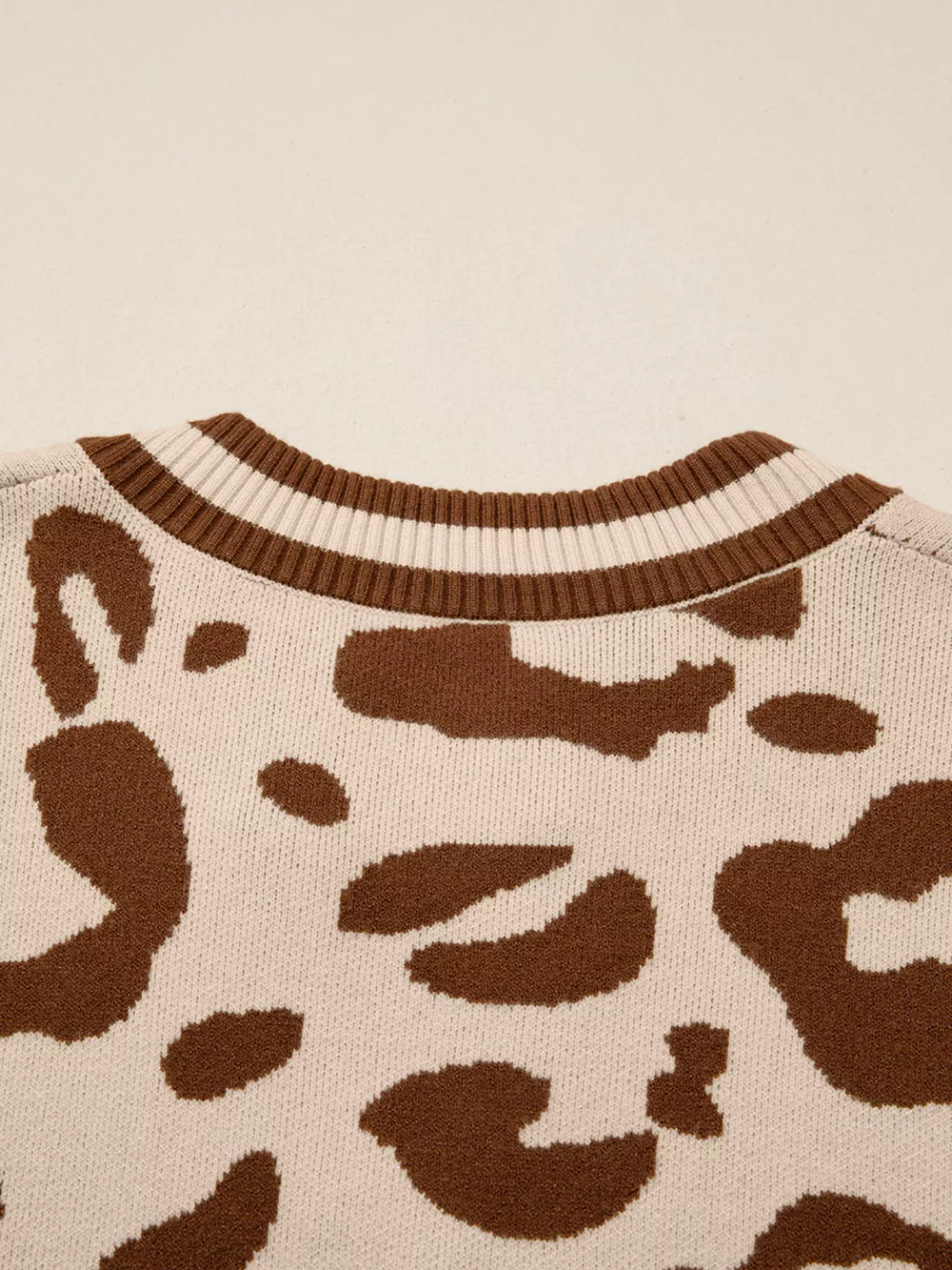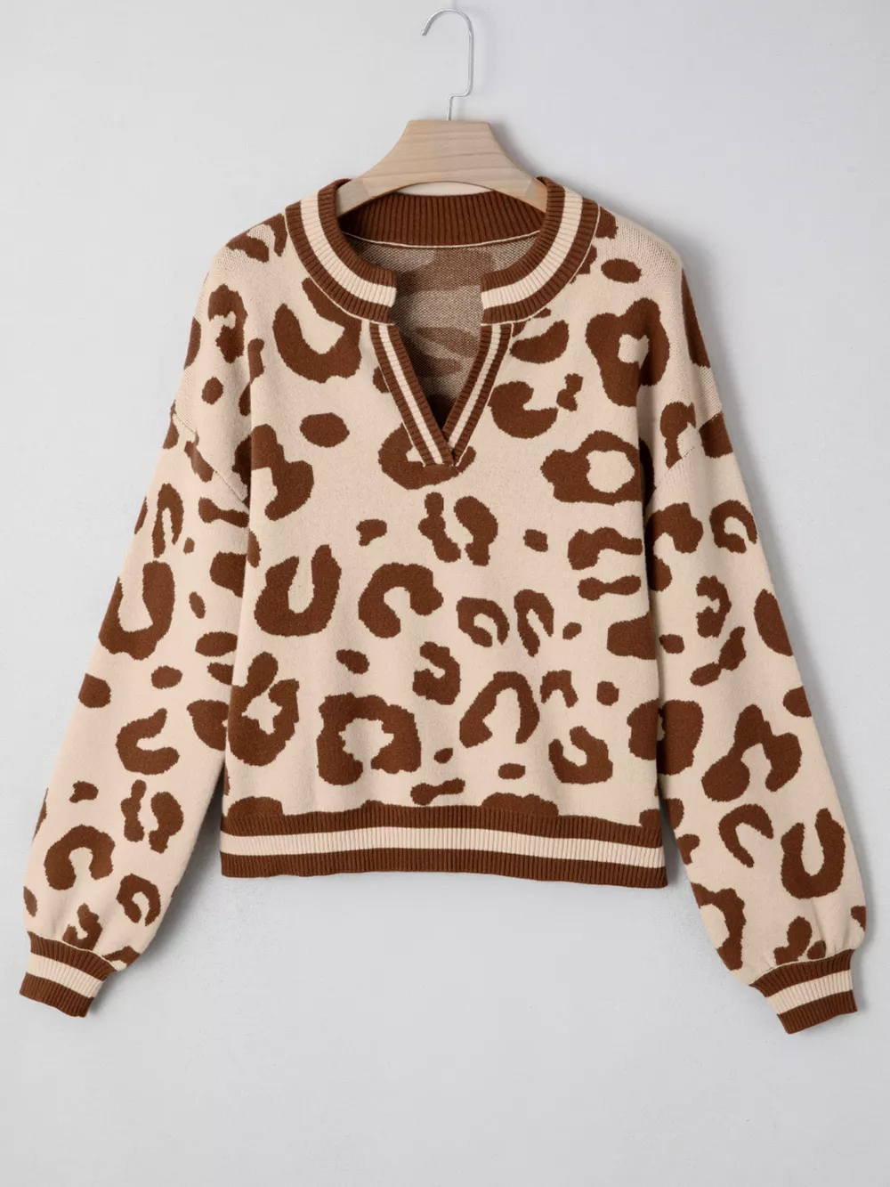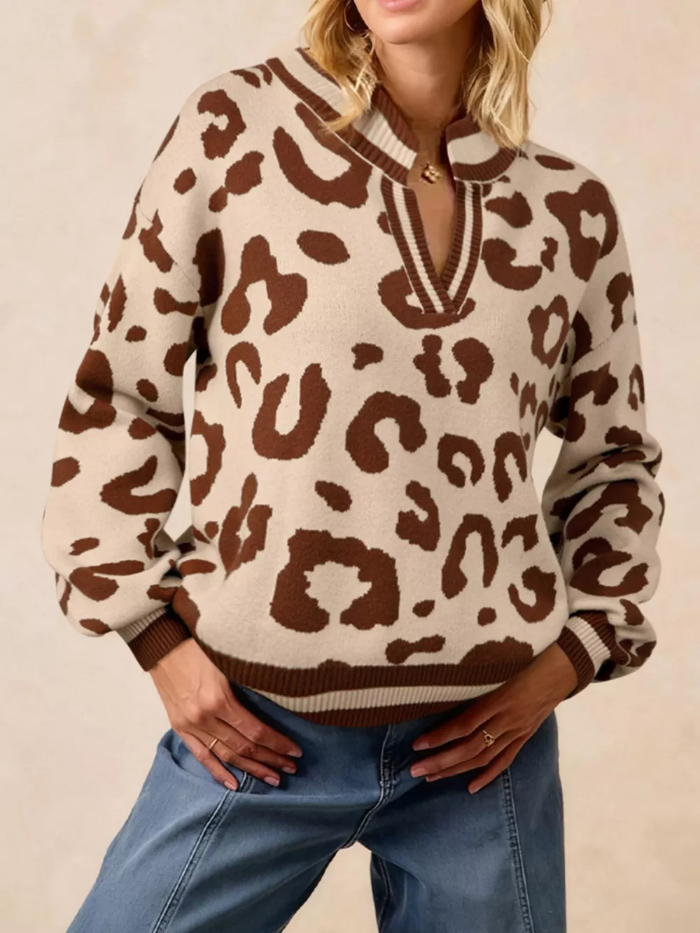 Leopard Knit Notched Casual Sweater