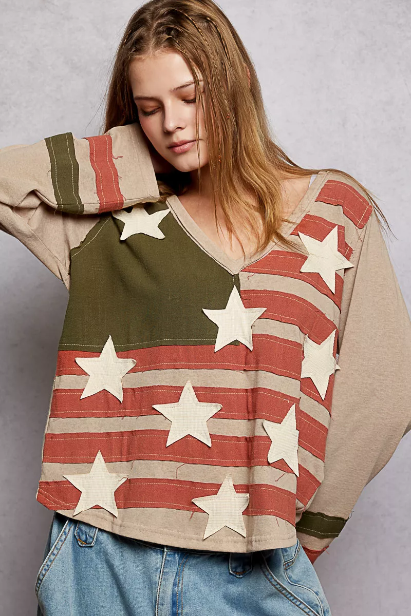 POL Double Gauze American Flag Patch V-Neck Long Sleeve T-Shirt