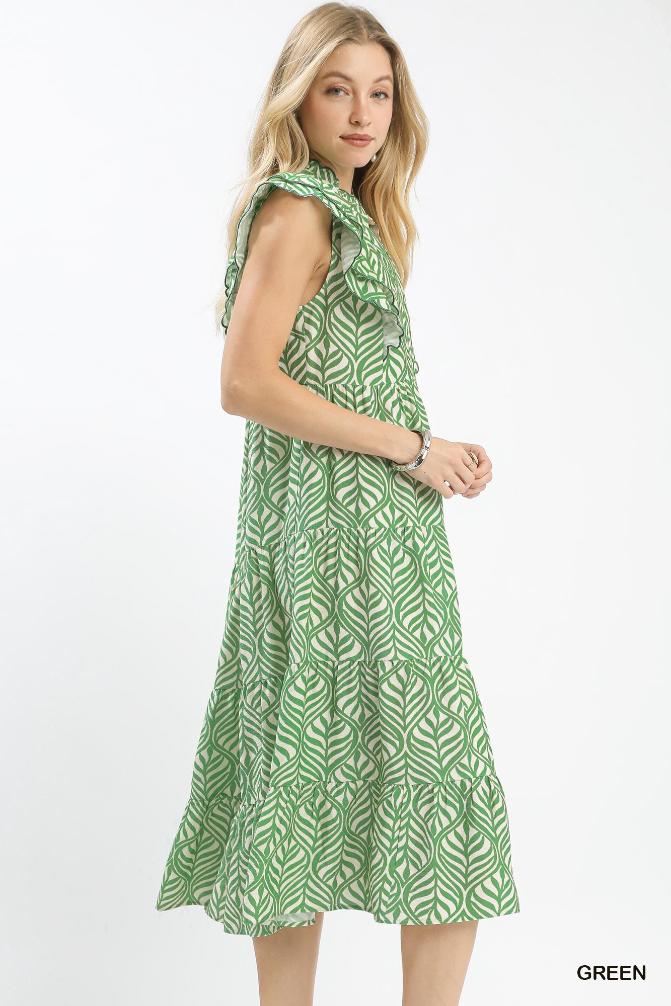 Umgee Leaf Print Tiered Midi Dress with Ruffle Detail