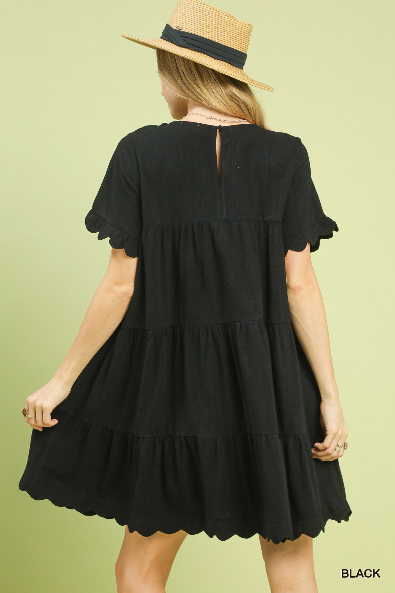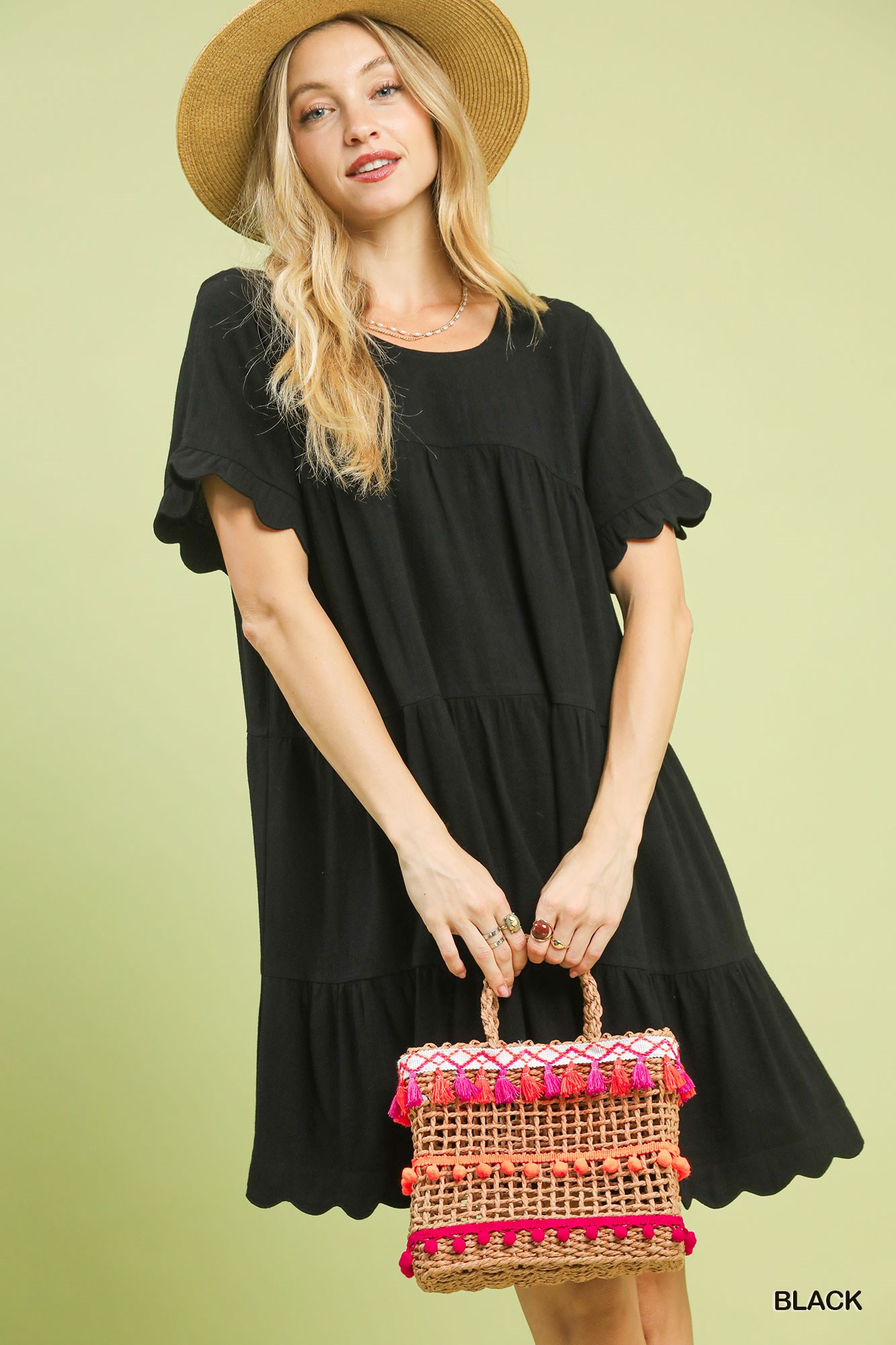 Introducing the Linen Tiered Babydoll Dress in the captivating Umgee color Peony, featuring key details such as a tiered silhouette and ruffle short sleeves for a charming and stylish look. The round neckline adds a classic touch, while the scalloped hem detail offers a unique and trendy element. Crafted from linen, this dress provides a lightweight and breathable feel, perfect for sunny days. With a not lined design, this dress is great for casual outings or dressing up for special occasions. Embrace effortless elegance and femininity with this Linen Tiered Babydoll Dress that combines comfort with chic style in the lovely Peony hue.