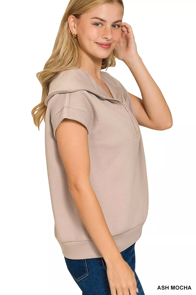 The Scuba Half Zip Top is a modern and sporty piece that offers a stylish and versatile addition to your wardrobe. Featuring a half-zip design, this top allows for adjustable coverage and adds a contemporary touch to your outfit. Made from scuba fabric, it provides a structured and sleek look that is comfortable to wear. This top is perfect for casual outings or active days, offering a blend of fashion and functionality. With its trendy design and practical features, the Scuba Half Zip Top is sure to become a favorite go-to option for your everyday styling needs.