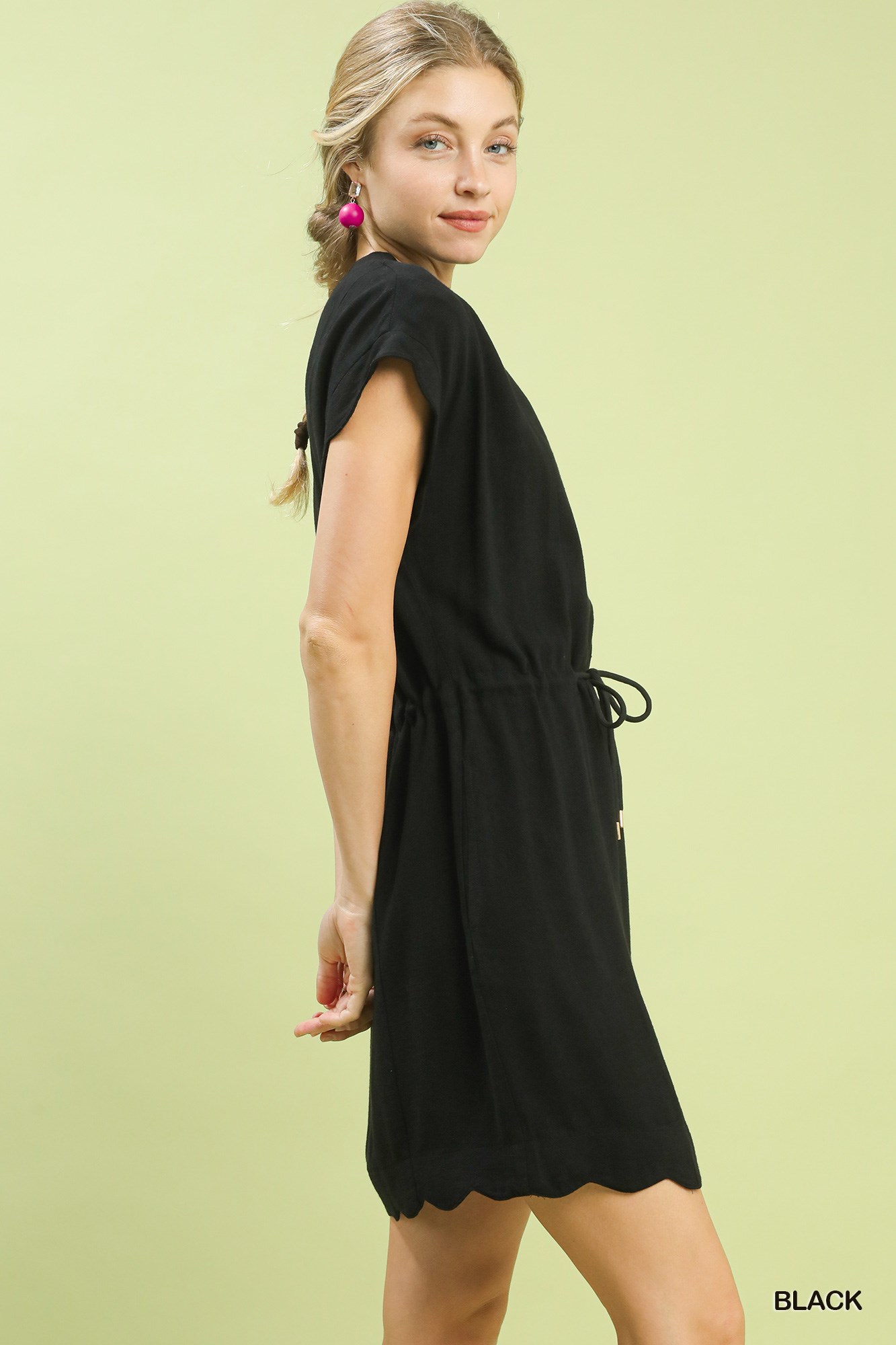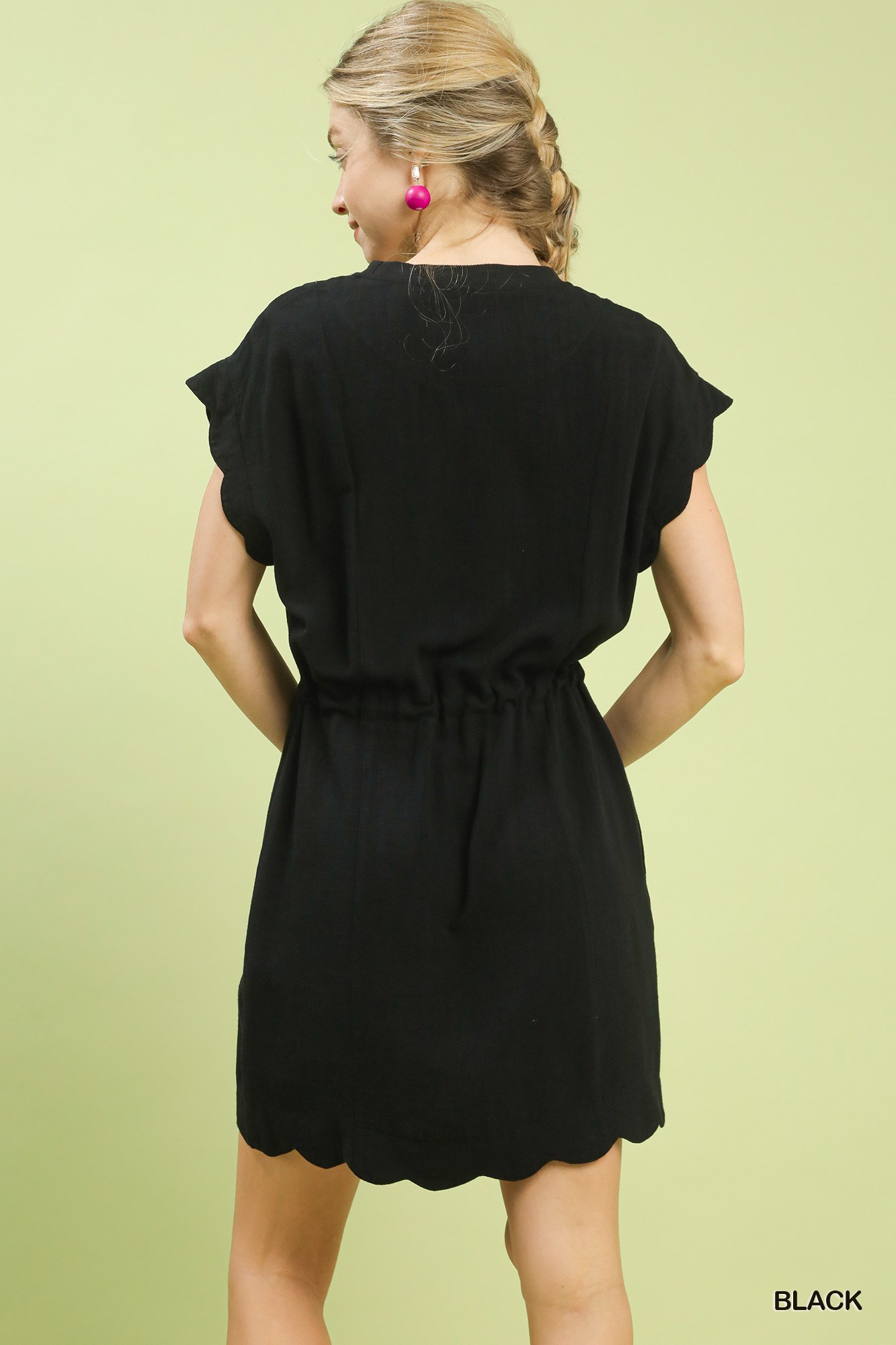This Umgee cerulean linen blend mini dress is the perfect blend of style and comfort. The solid color and drawstring waist create a flattering silhouette. The round crew neck and short flutter sleeves with scallop detail add a feminine touch. The scalloped hemlines give the dress a unique and playful edge. Ideal for a casual yet chic look for warm weather outings.