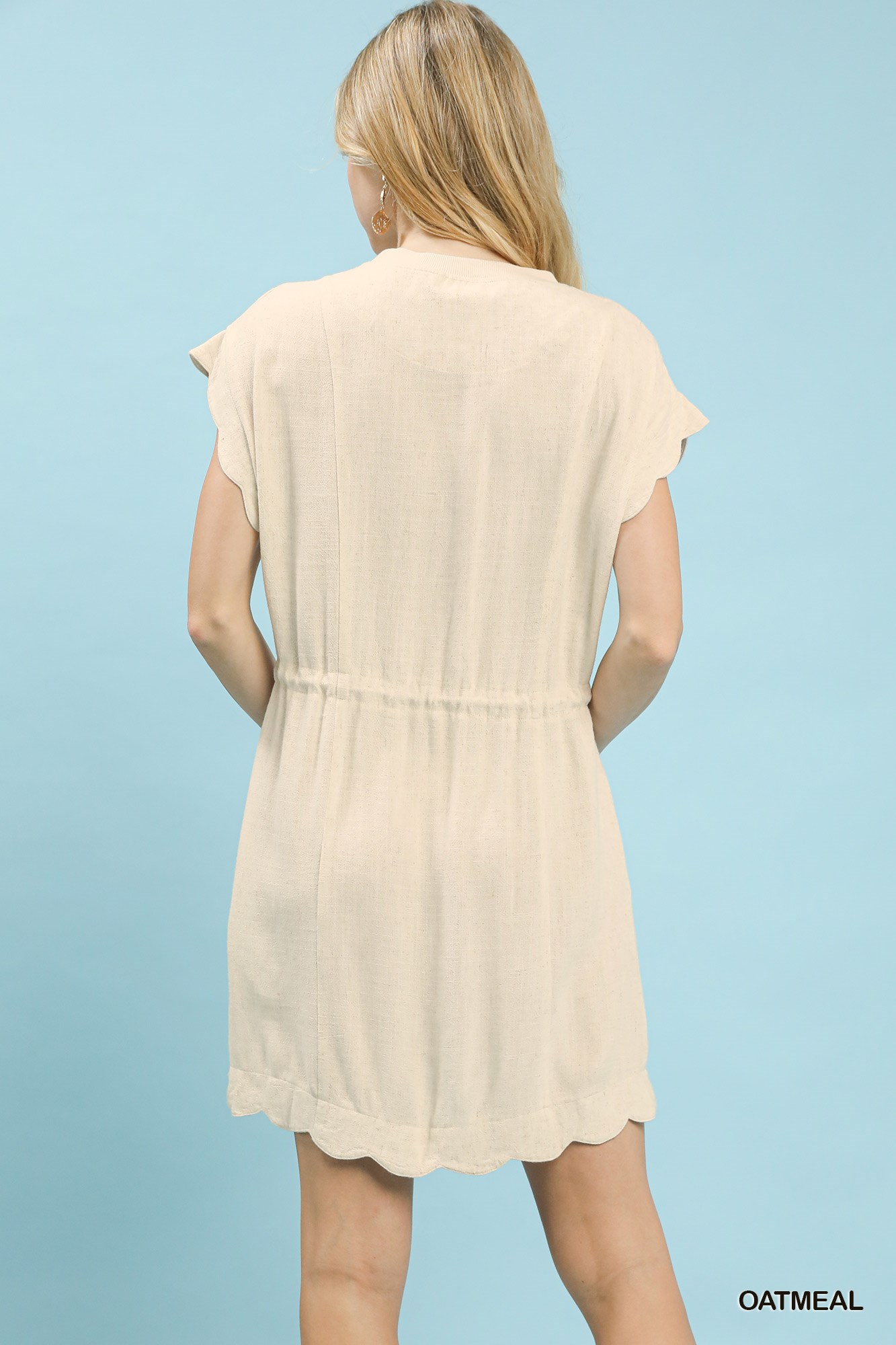 This Umgee cerulean linen blend mini dress is the perfect blend of style and comfort. The solid color and drawstring waist create a flattering silhouette. The round crew neck and short flutter sleeves with scallop detail add a feminine touch. The scalloped hemlines give the dress a unique and playful edge. Ideal for a casual yet chic look for warm weather outings.