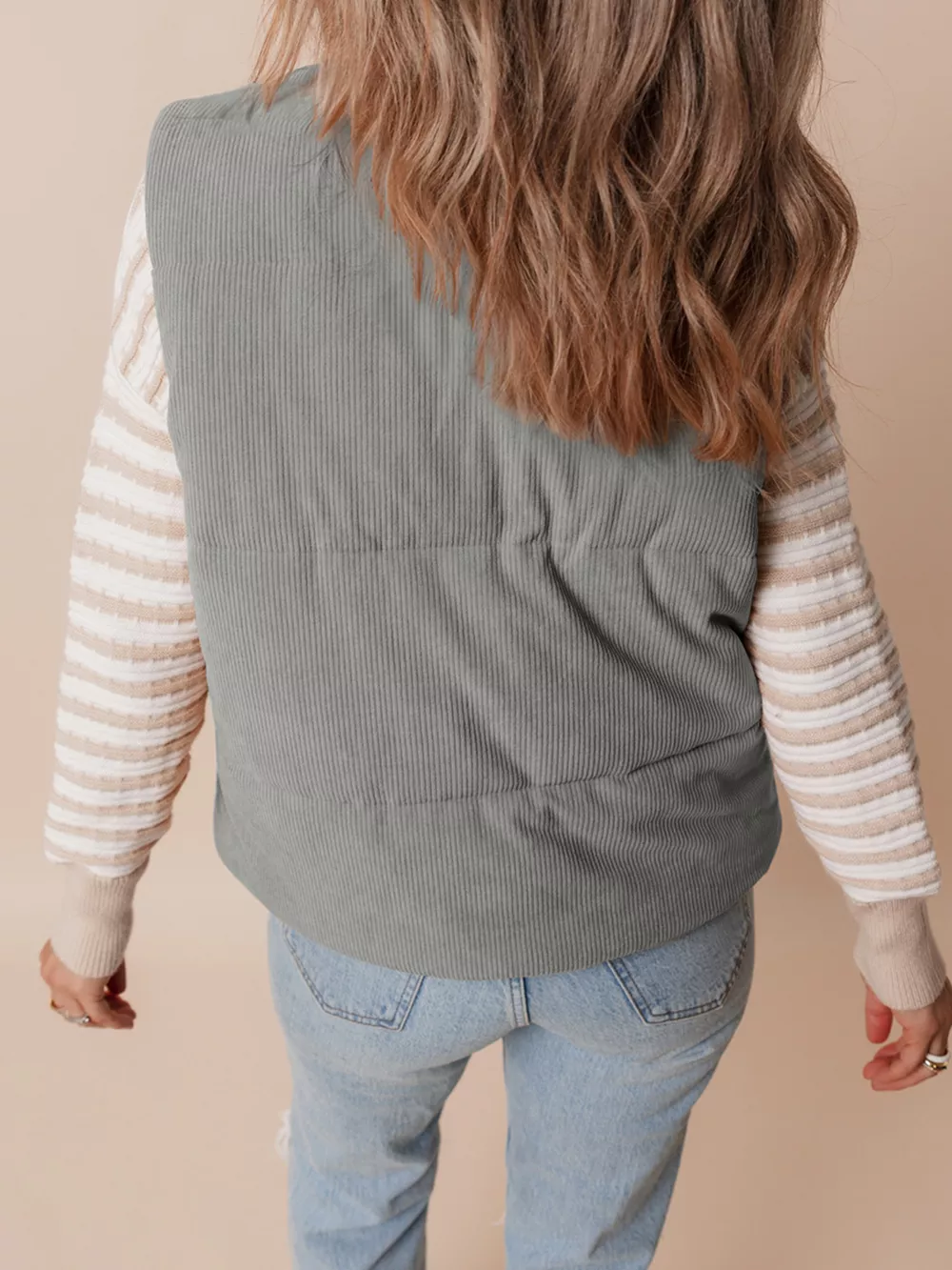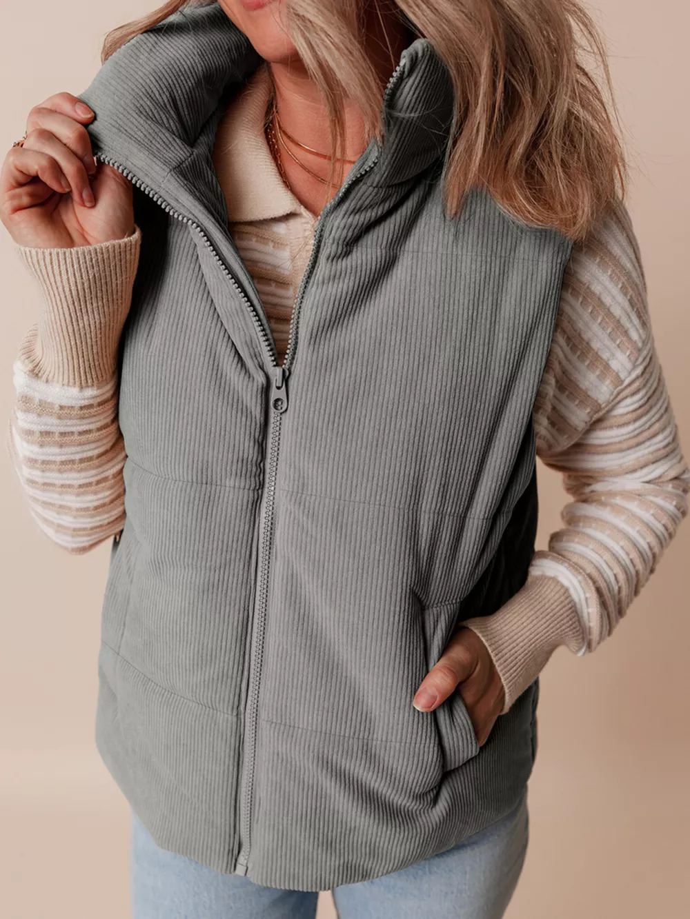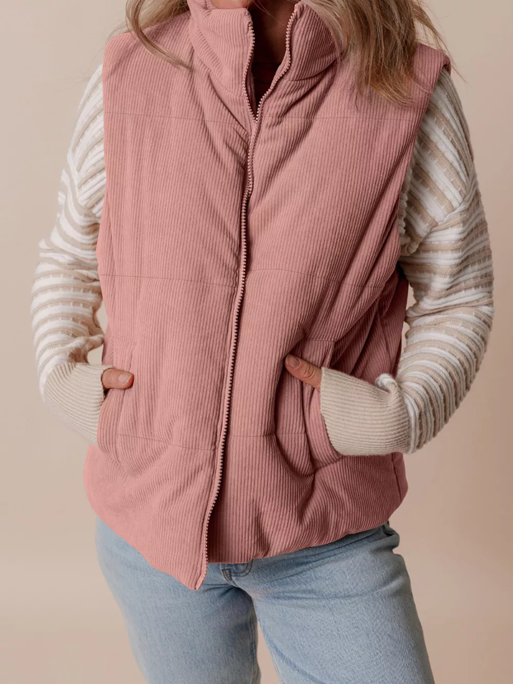 Corduroy Stand Neck Zipped Puffer Vest