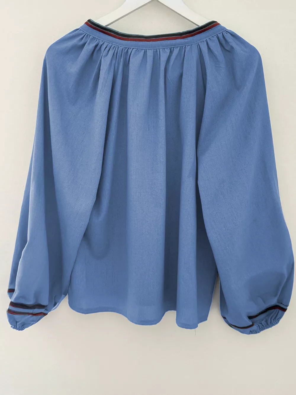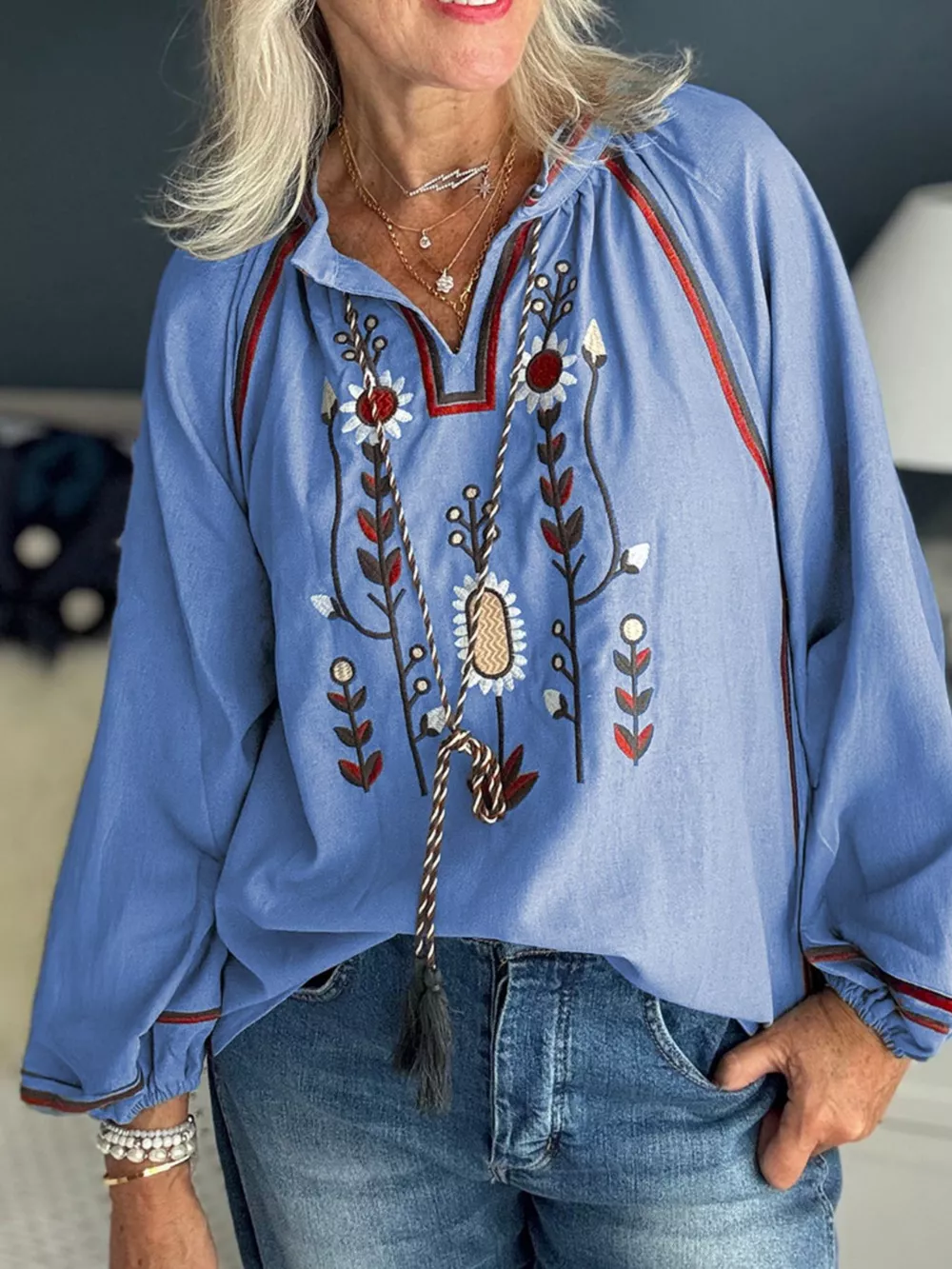 Floral Embroidered Split Neck Tassel Tie Puff Sleeve Blouse