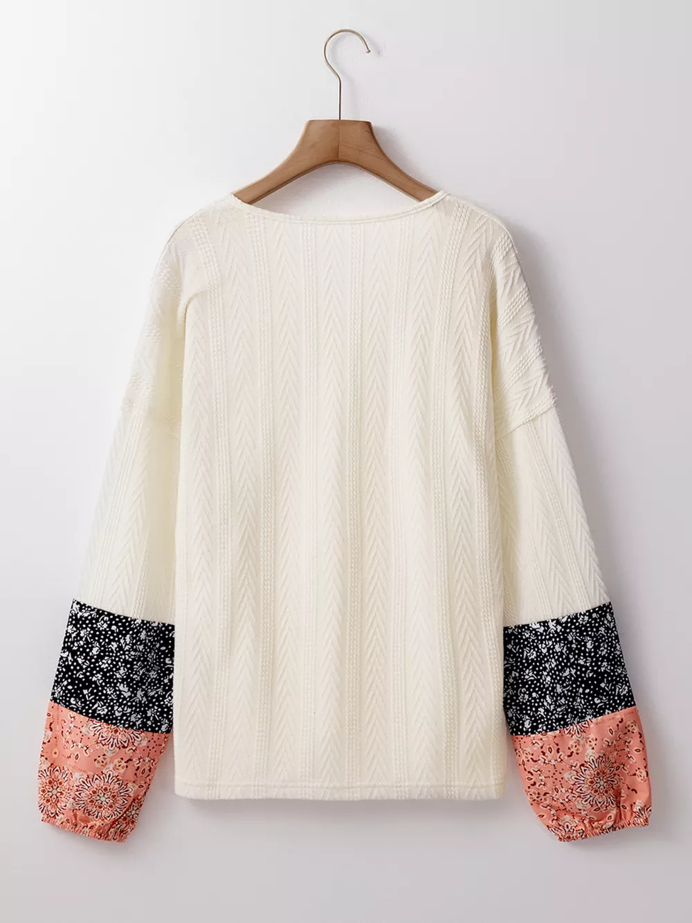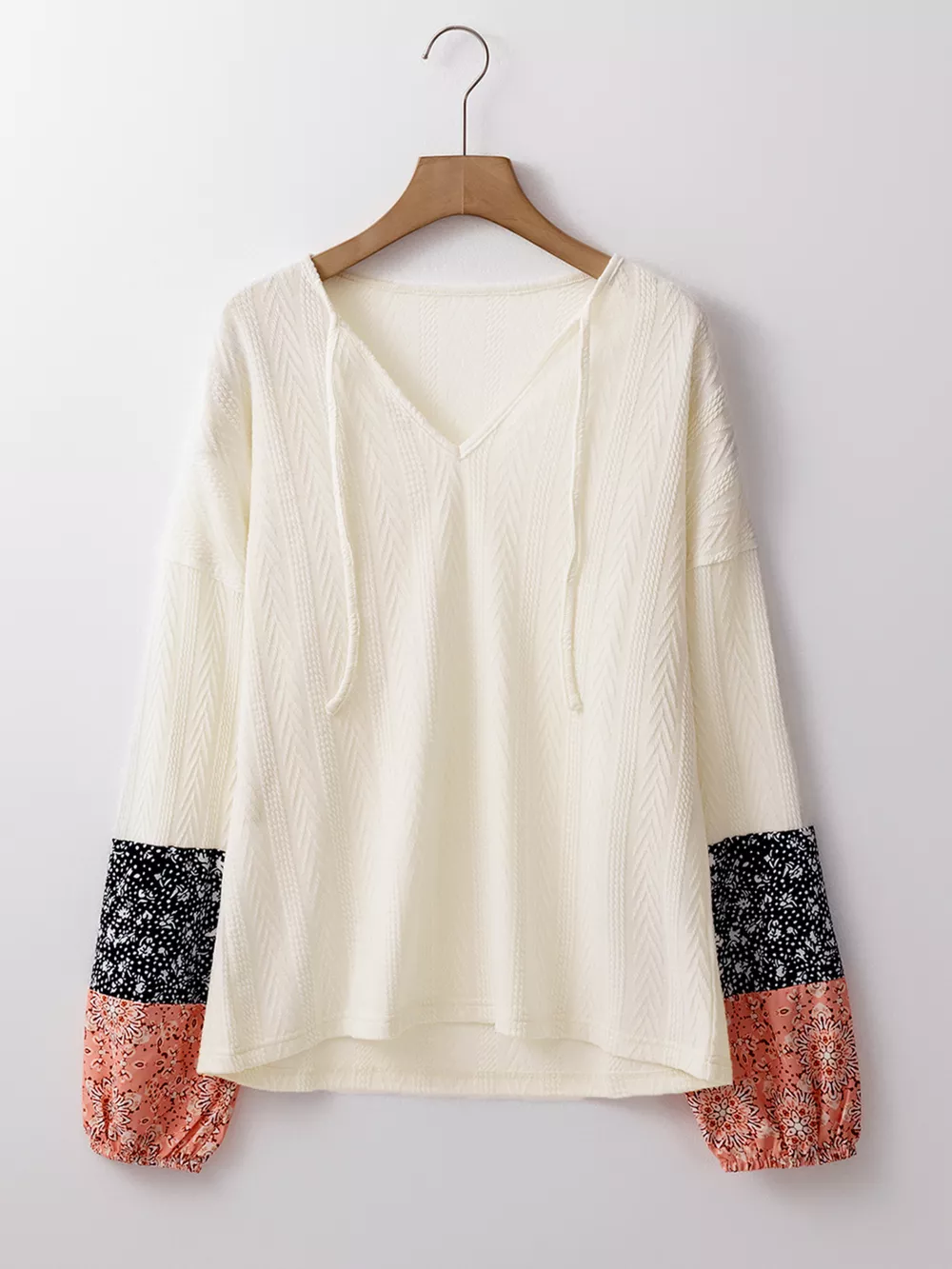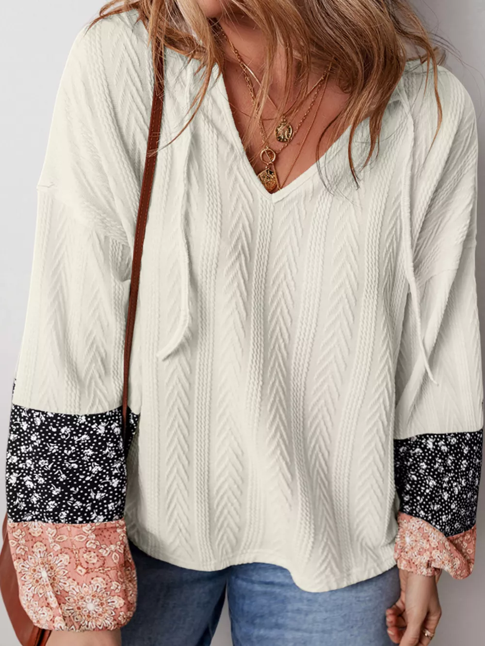 Floral Patchwork Textured Knit Drawstring V Neck Blouse