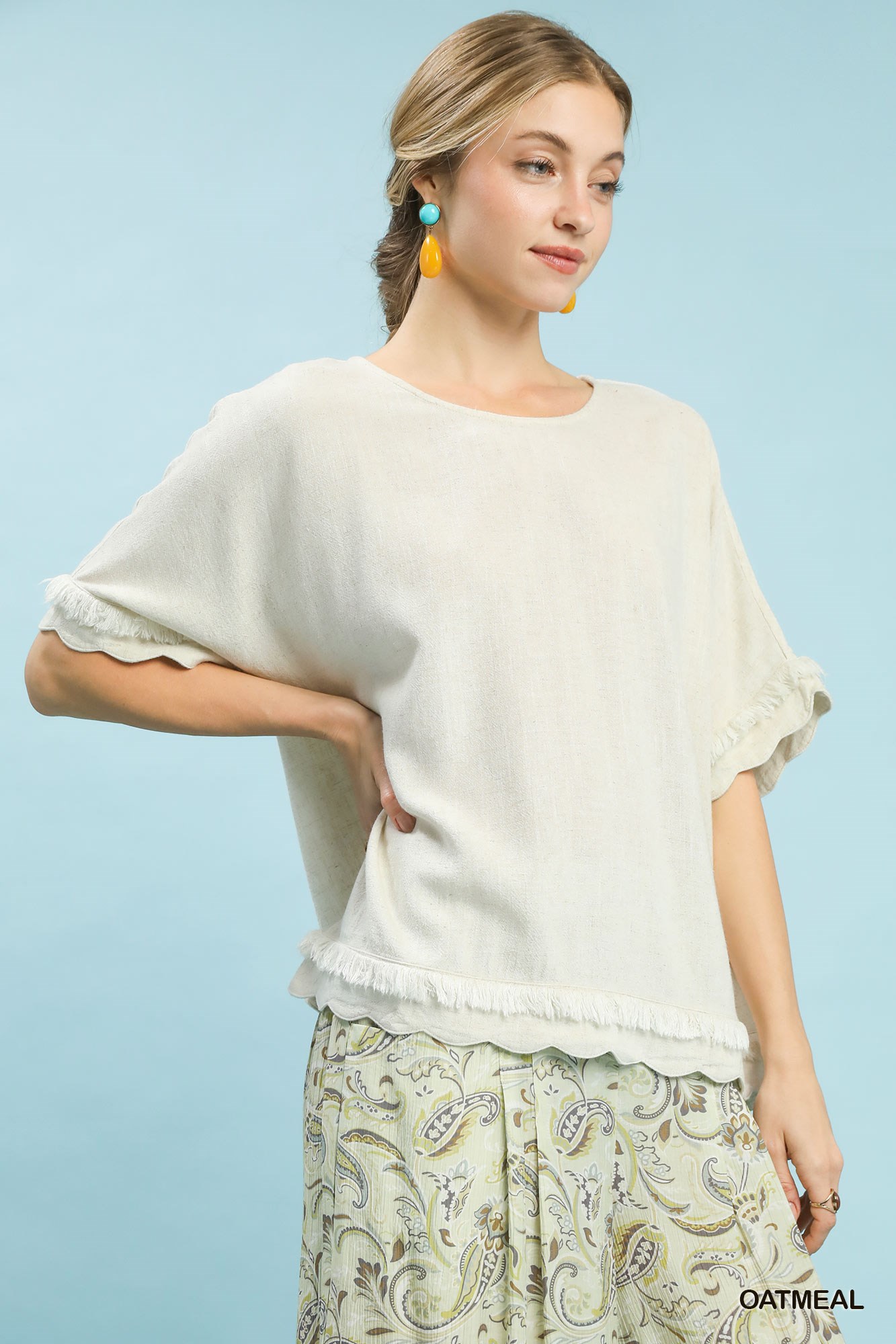 Umgee Linen Frayed Hem Scallop Edge Top