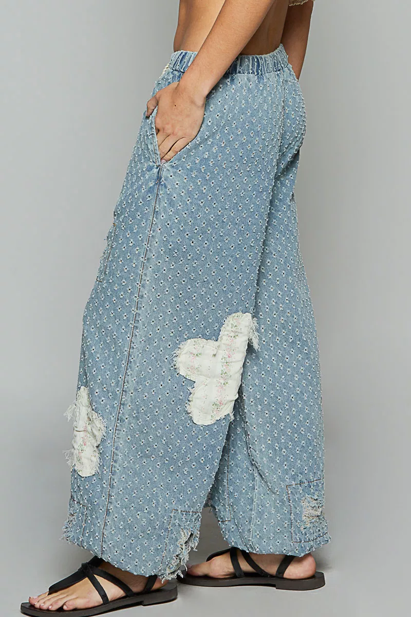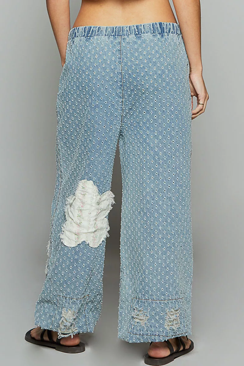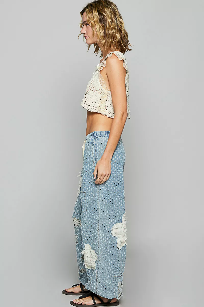POL Floral Patch Washed Textured Twill Pants with Crochet See Thru Patch