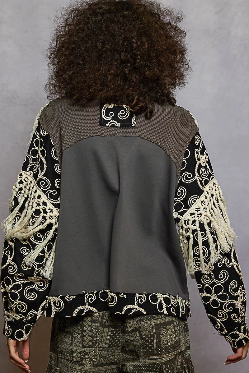 POL Contrast Floral Embroidery Balloon Sleeve Top with Tassel Trim