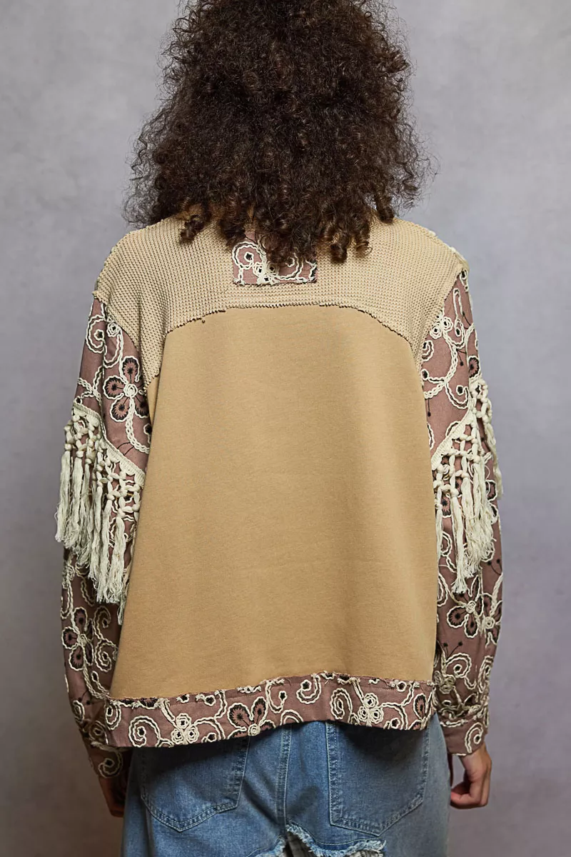 POL Contrast Floral Embroidery Balloon Sleeve Top with Tassel Trim
