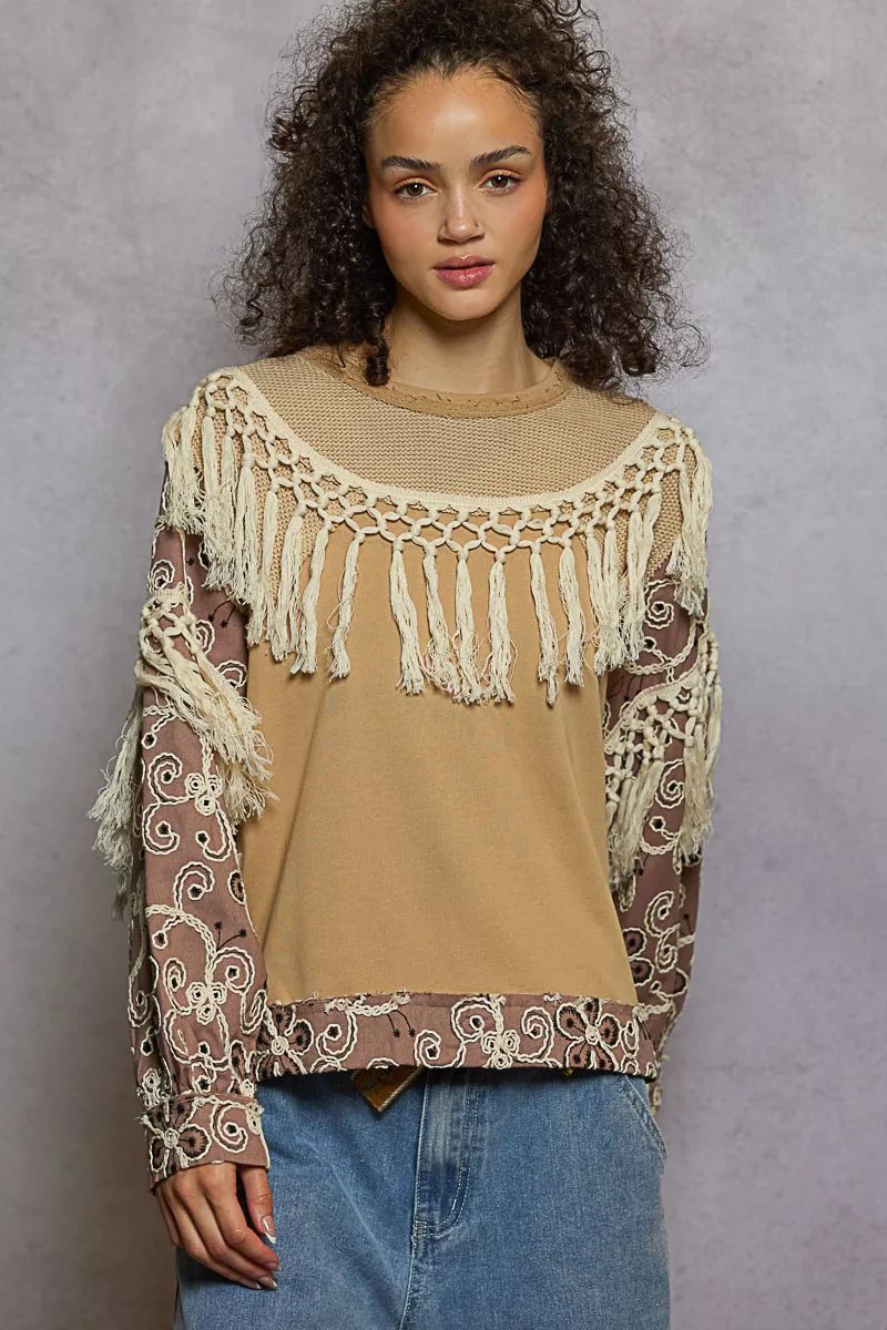 This top is designed with a round neck and balloon sleeves for a trendy and relaxed style. The oversized fit adds a chic and cozy element to the garment. Featuring French terry fabric with embroidery contrast, this top combines comfort with a touch of sophistication. The tassel trim adds a fun and unique detail to the design. Elevate your casual look with this fashionable and eye-catching top!