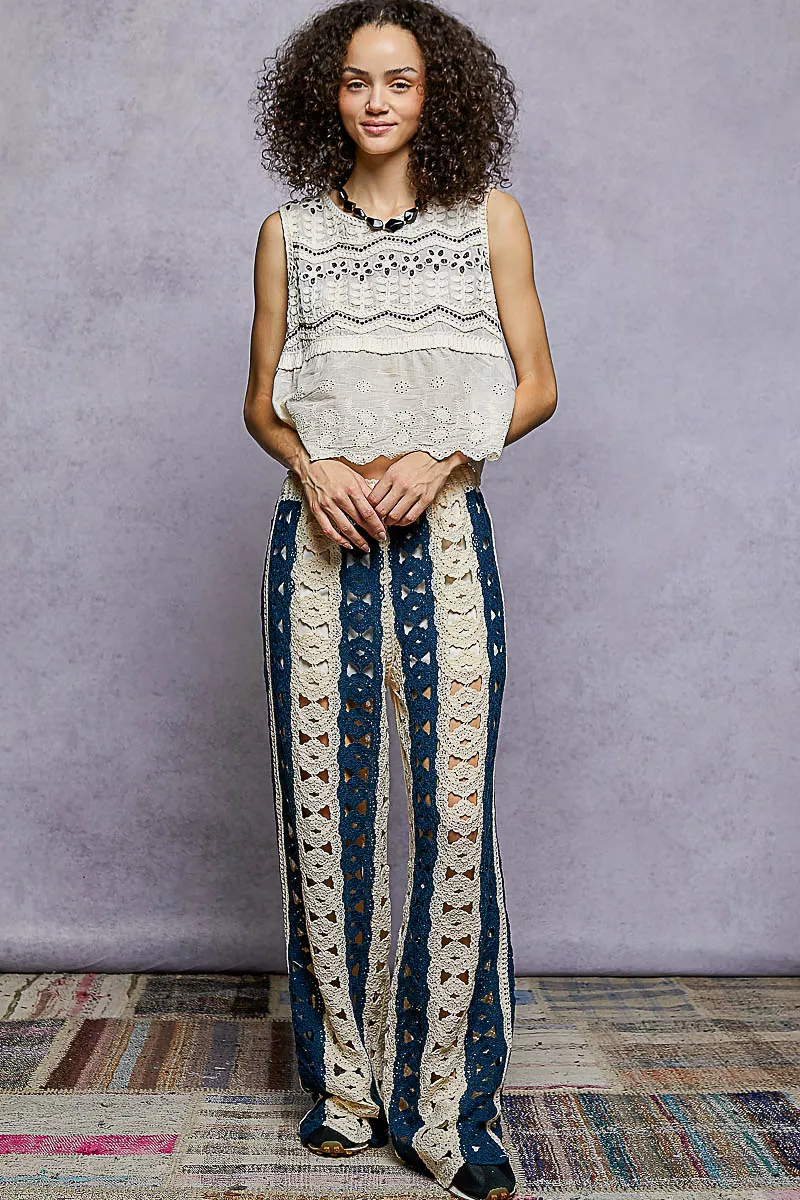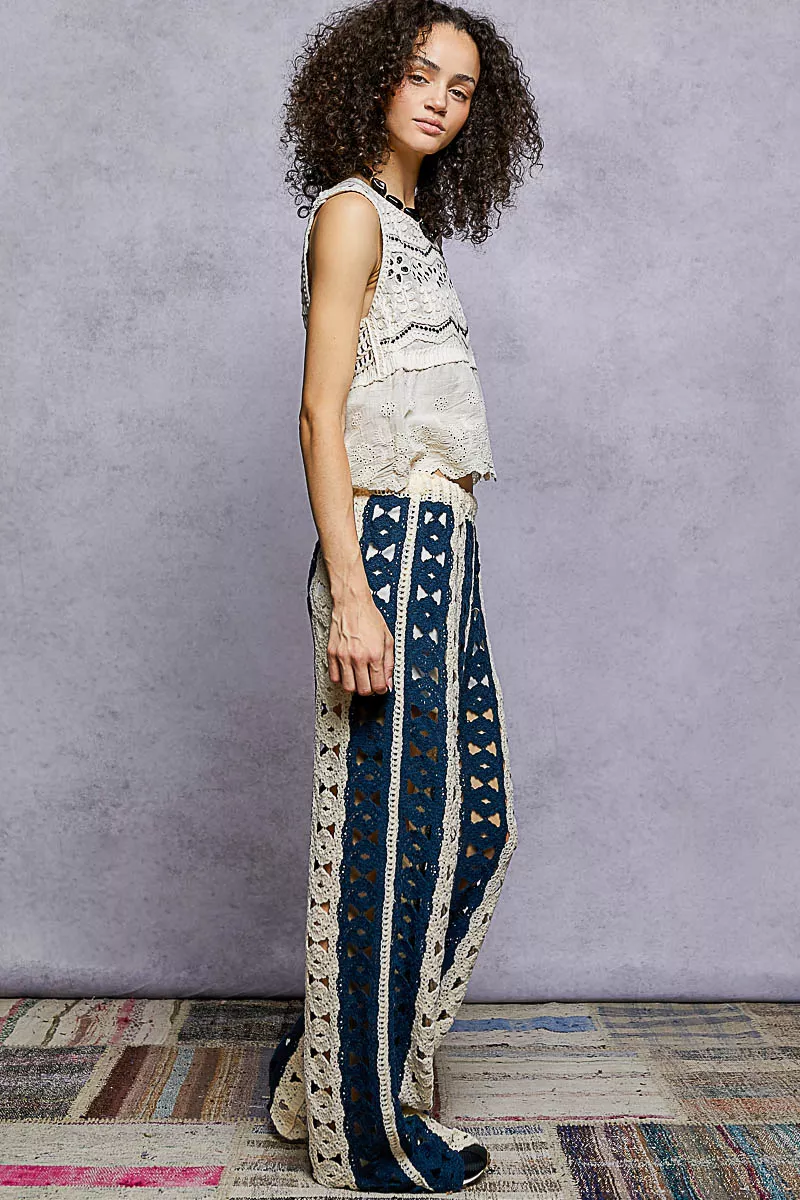 Elevate your summer style with these wide-leg crochet pants featuring varied patterns and stripe detail. The elasticized waistband ensures a comfortable and flattering fit. Perfect for a bohemian-inspired look, these pants are designed to make a statement. Pair them with a simple top and sandals for a laid-back yet fashionable outfit. Enjoy the airy and breezy feel of these unique pants for any warm-weather occasion.