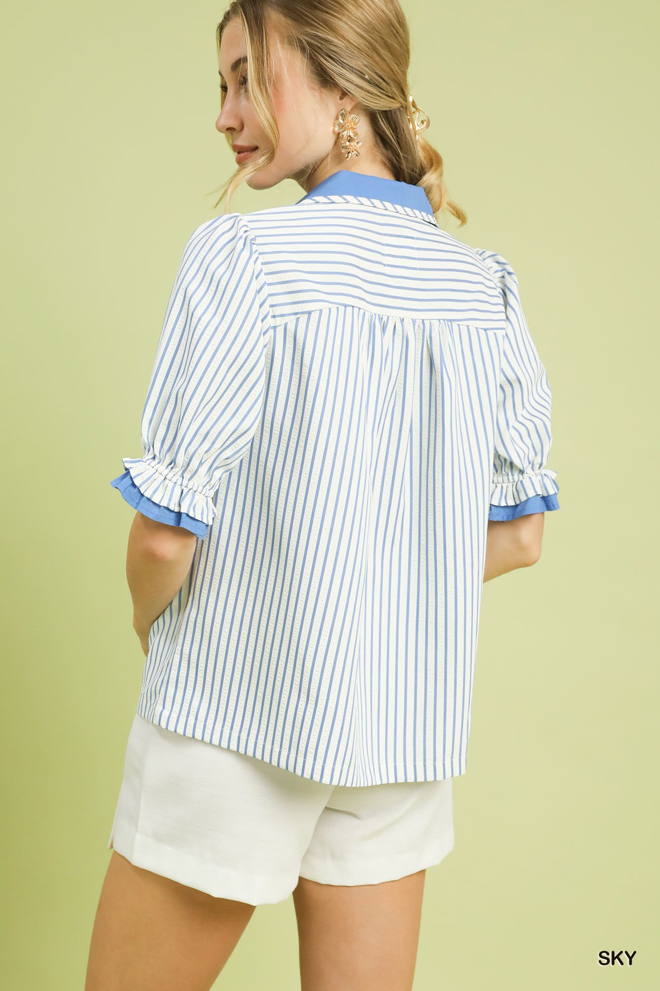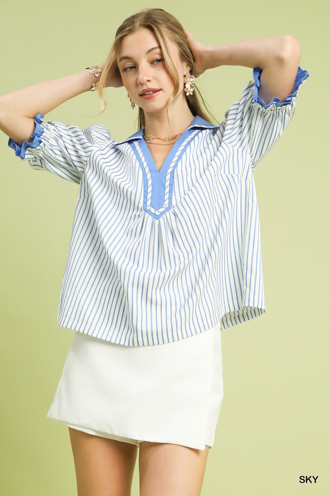 Umgee Seersucker Stripe Ruffle Sleeve Top