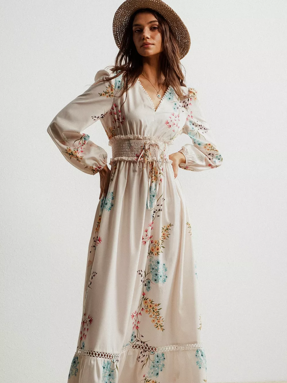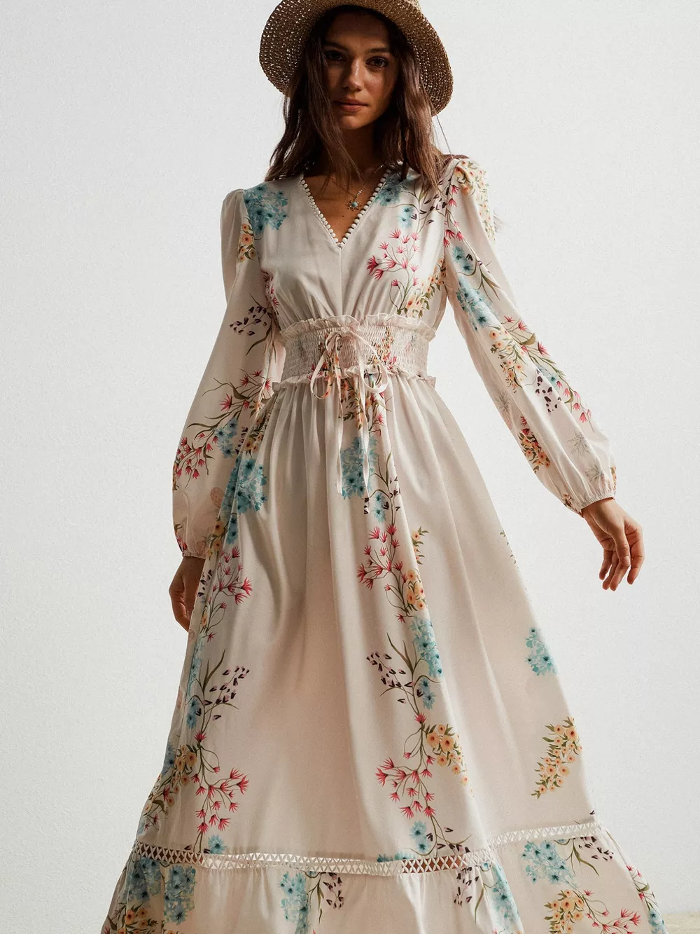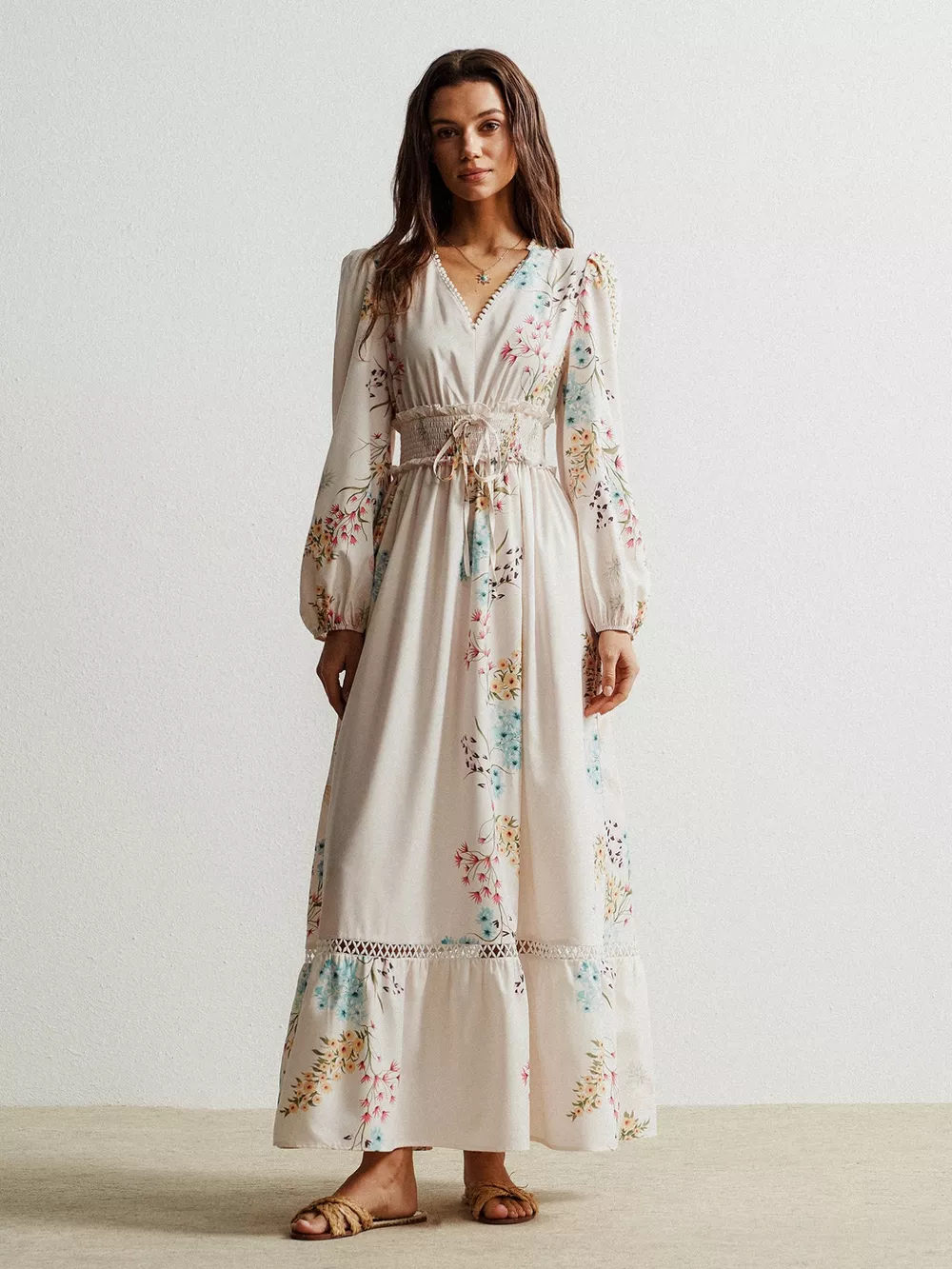Floral Print Long Sleeve Maxi Dress with Smocked Waist