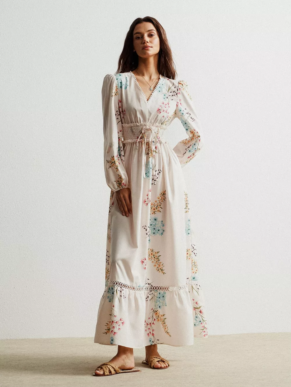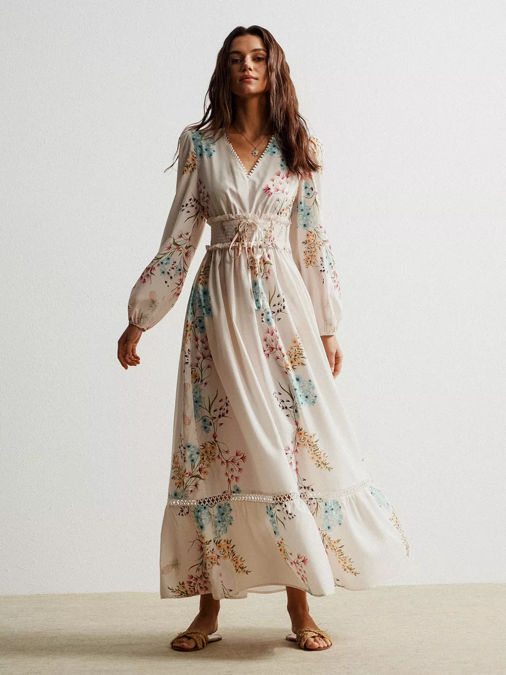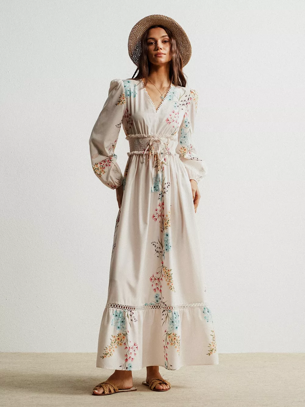 Floral Print Long Sleeve Maxi Dress with Smocked Waist