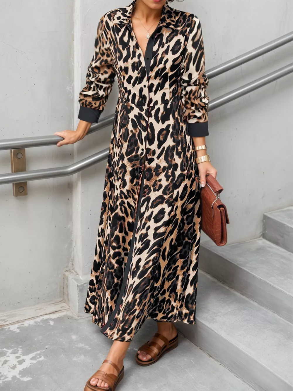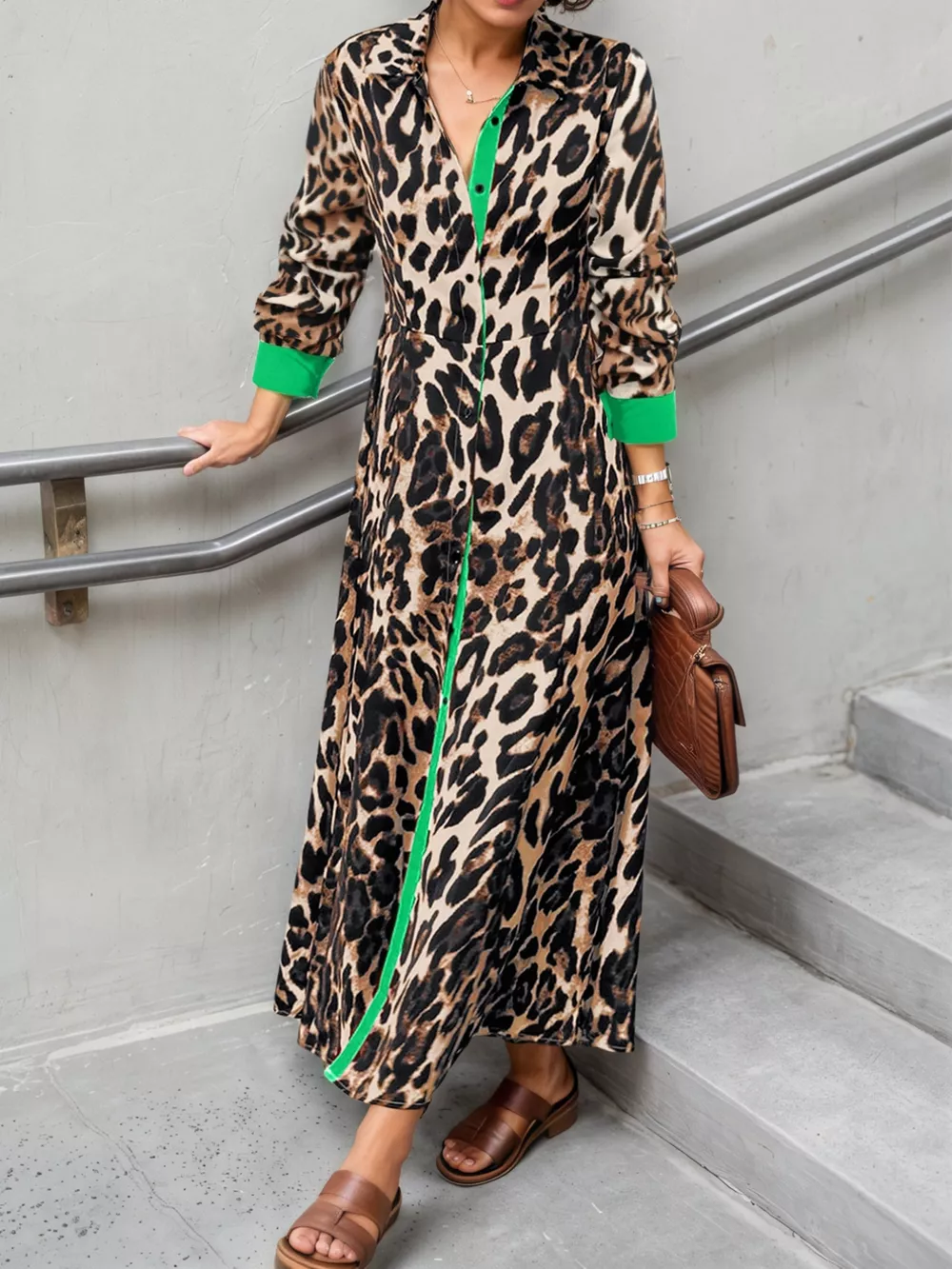 Leopard Print Long Sleeve Shirt Dress with Contrast Trim