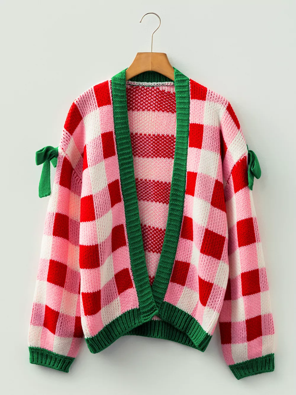 Checkered Bow-Tie Sleeve Knit Christmas Cardigan