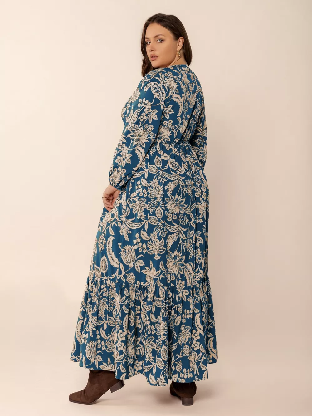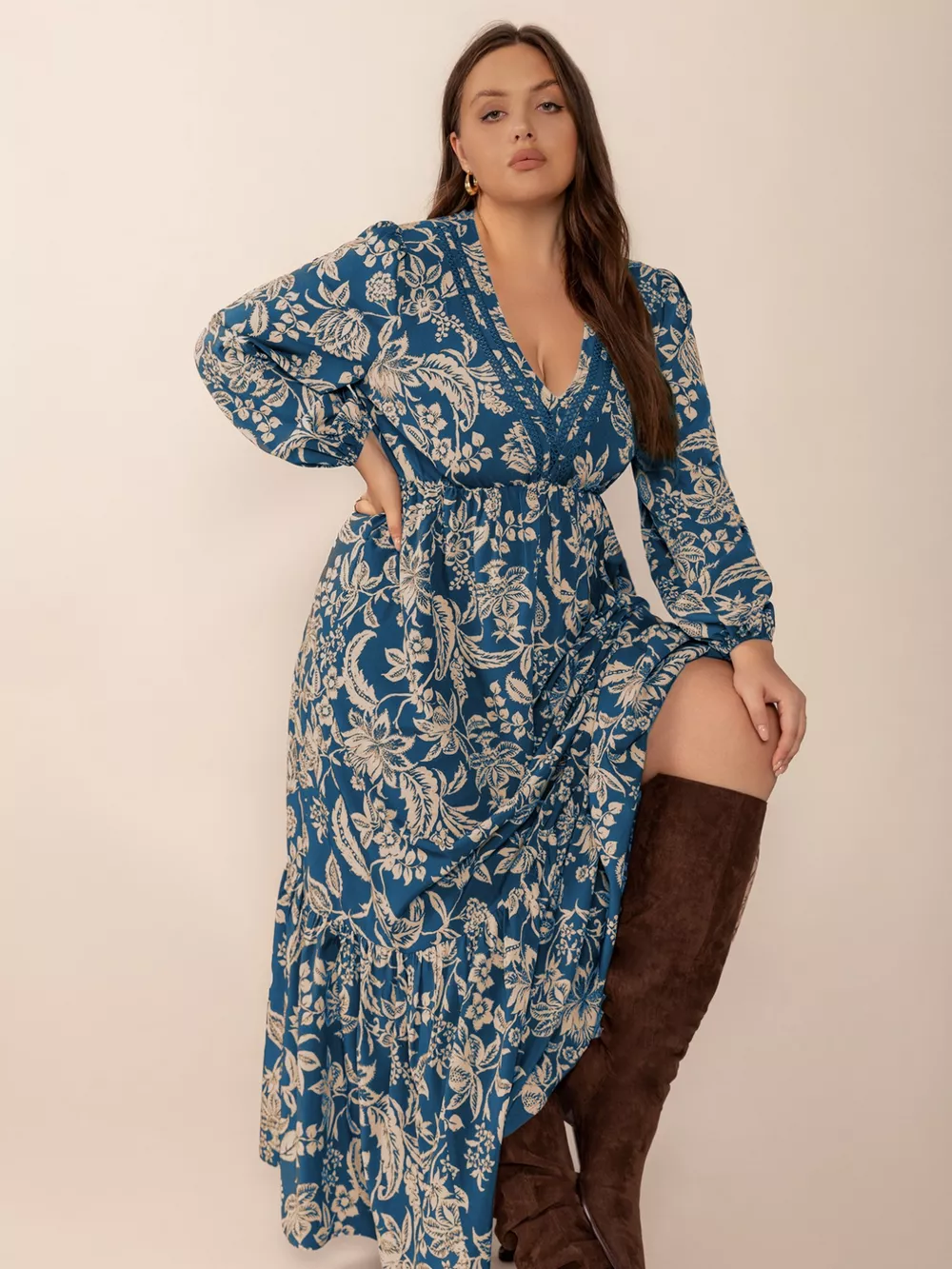 Plus Size Boho Floral Print Long Sleeve Maxi Dress