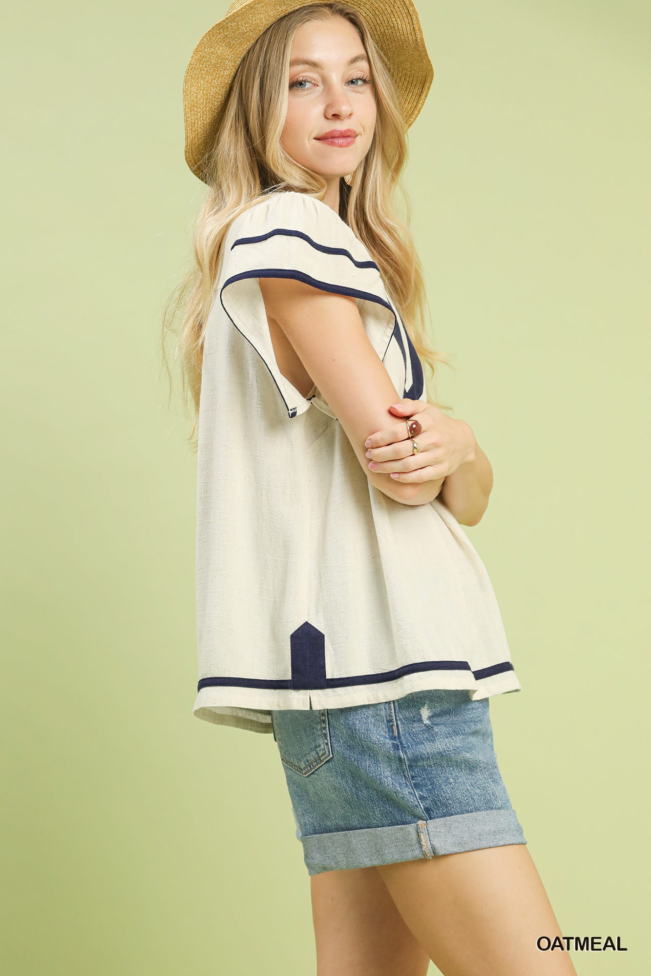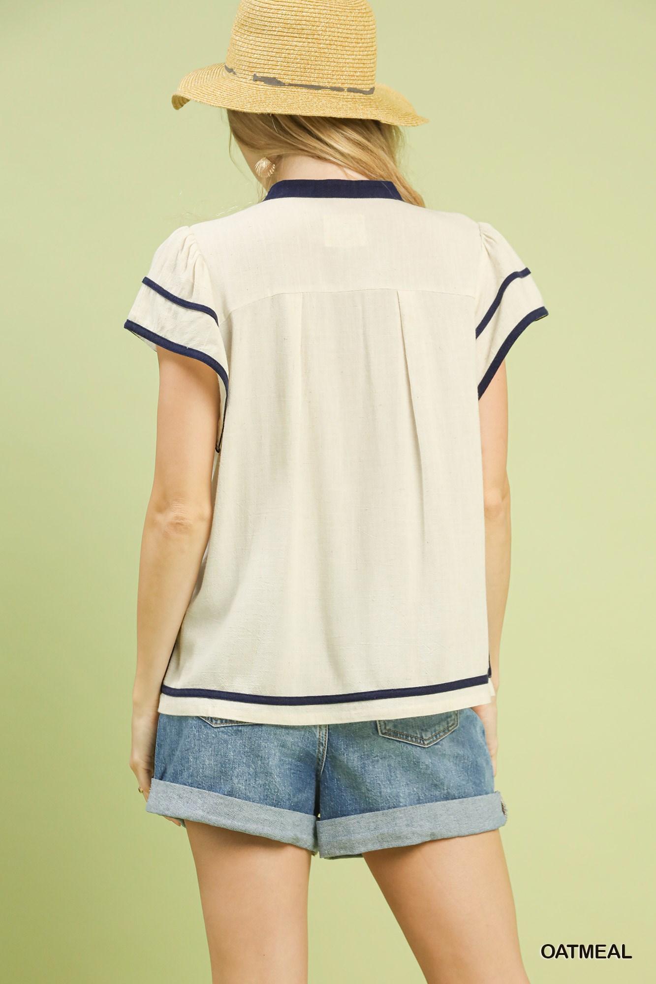 This Linen Ruffle Sleeve Top is a must-have piece crafted from breathable linen fabric, perfect for warm weather days. It features a split V-neck design with contrast trim detail, adding a modern and chic touch to the top. The straight hem with border accent provides a clean and polished finish to the look. This versatile top can easily be dressed up or down for various occasions, making it a wardrobe staple. Please note that this top is not lined, ensuring a lightweight and comfortable feel when worn.