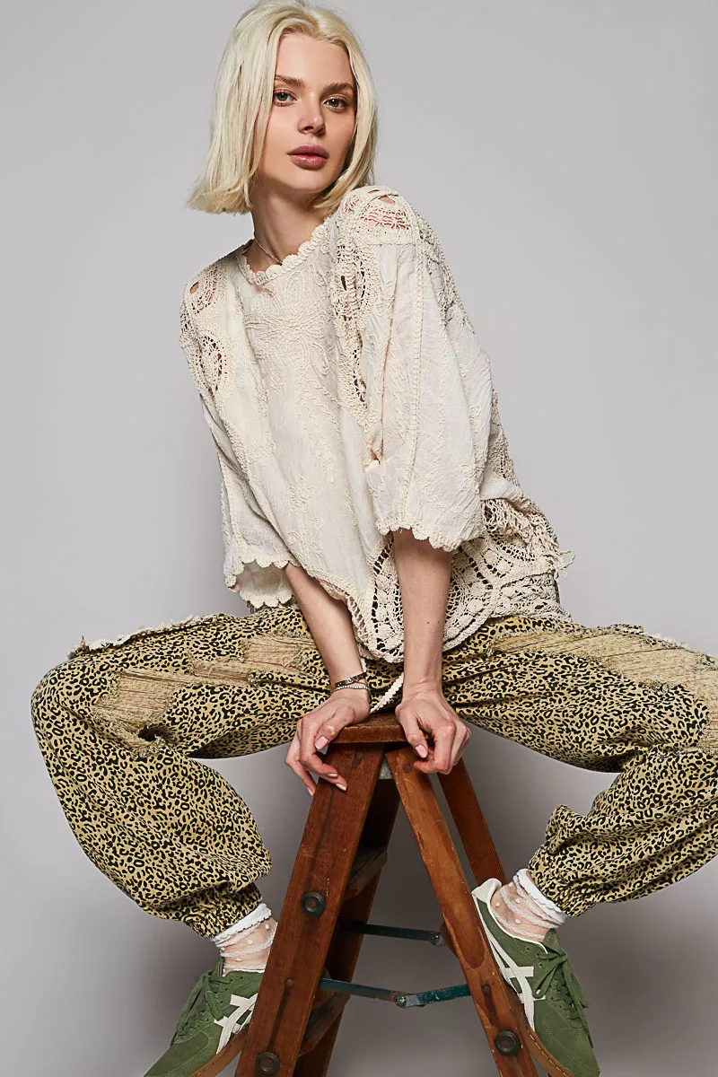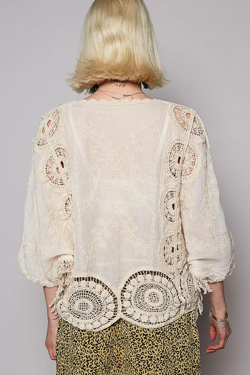 POL Round Neck Crochet Top with Floral Embroidery Detail