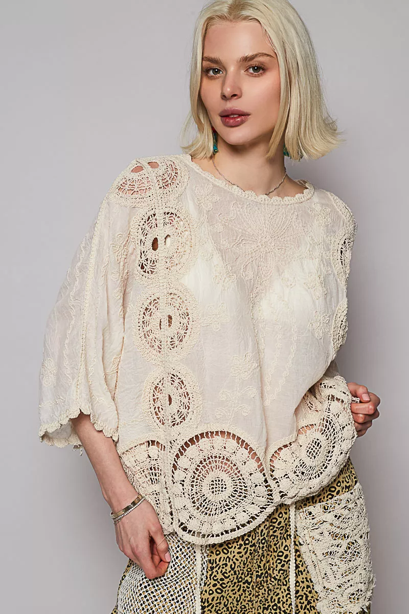 This round neck short sleeve top is designed with a roomy fit and crafted in crochet with various weave knit patterns for a textured and intricate look. The floral embroidery detailing adds a touch of elegance and femininity to this stylish top. Perfect for adding a bohemian flair to your outfit, this top is versatile and easy to style for a casual or dressed-up look. The combination of crochet and embroidery creates a unique and eye-catching design that is perfect for standing out in style. Elevate your wardrobe with this beautifully detailed top that exudes a trendy and chic vibe.
