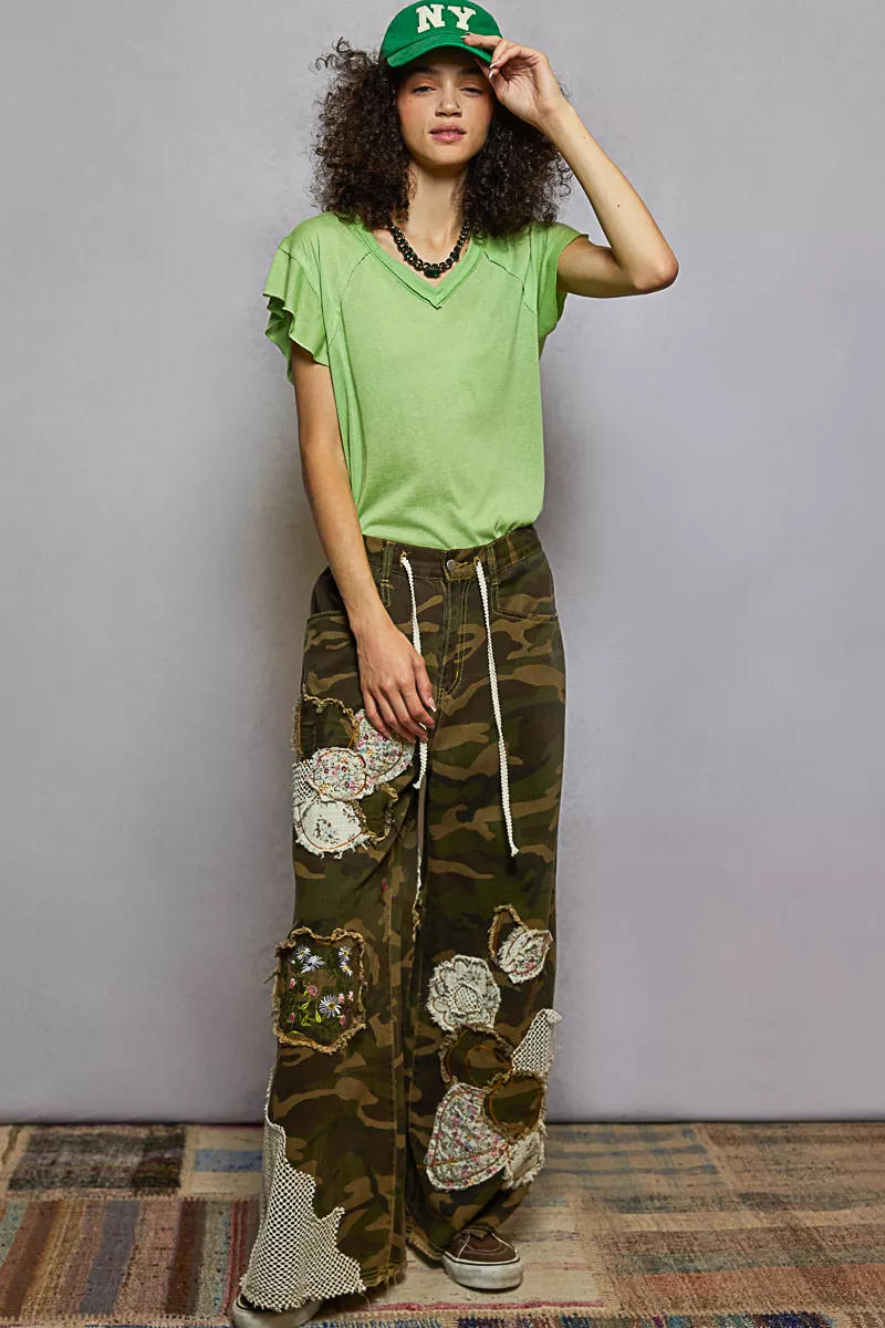 This V-neck short sleeve top is designed with a regular fit and crafted from soft cotton for all-day comfort. The ruffle sleeves and out seam detail add a touch of feminine charm and unique style to this top. Featuring vintage washing for a trendy worn-in look, this top comes in a solid color that is versatile and easy to mix and match with other pieces in your wardrobe. Elevate your casual outfit with this chic and effortlessly stylish top that combines comfort and fashion in one piece. Perfect for everyday wear, this top will become a go-to favorite in your wardrobe.