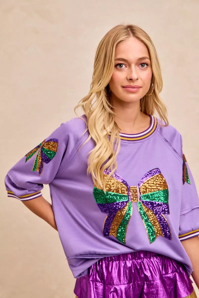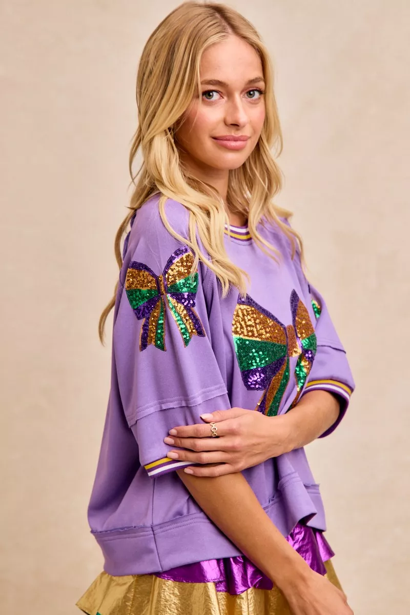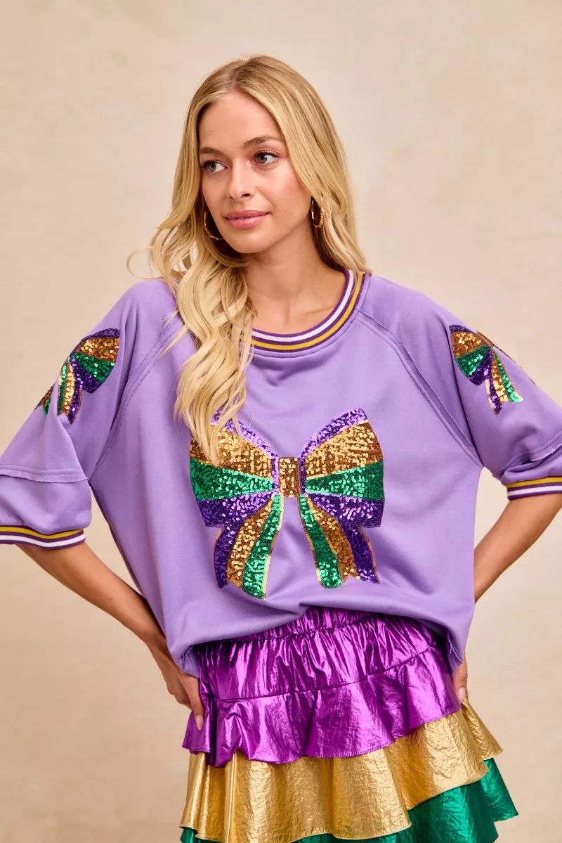 Get ready to celebrate in style with this Mardi Gras Theme Ribbon Sequin Patched Top! The vibrant colors and sequin patches embody the festive spirit of Mardi Gras. Stand out and sparkle at your next event with this eye-catching top. The ribbon details add a touch of elegance to the playful design. Embrace the Mardi Gras theme and add a fun and festive flair to your wardrobe with this fabulous top.