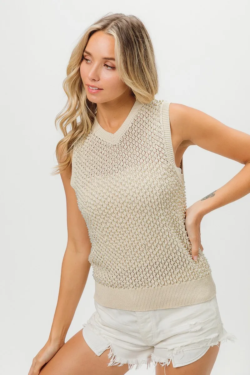 BiBi Knitted Beaded Pearl V Neck Sleveless Top