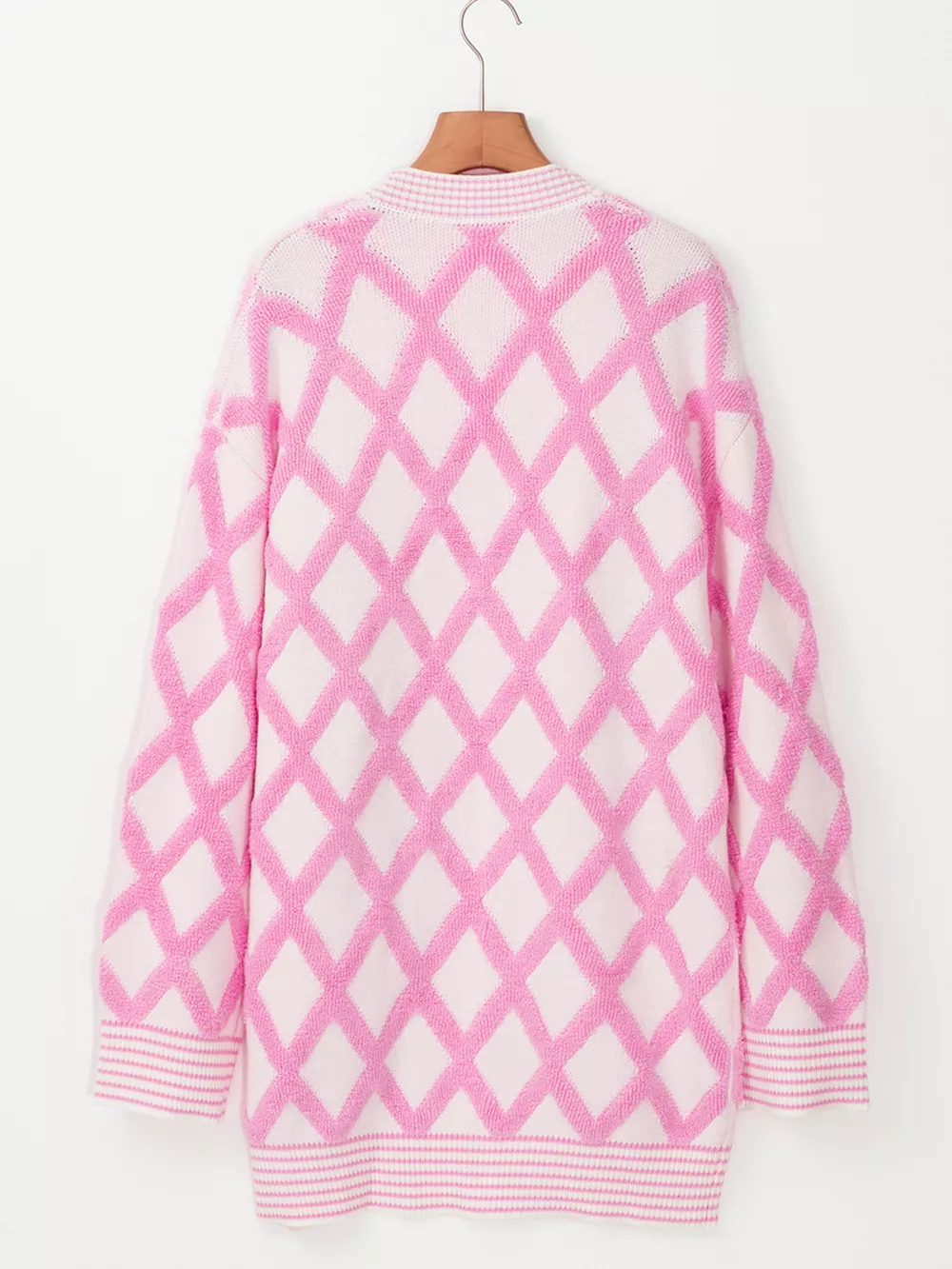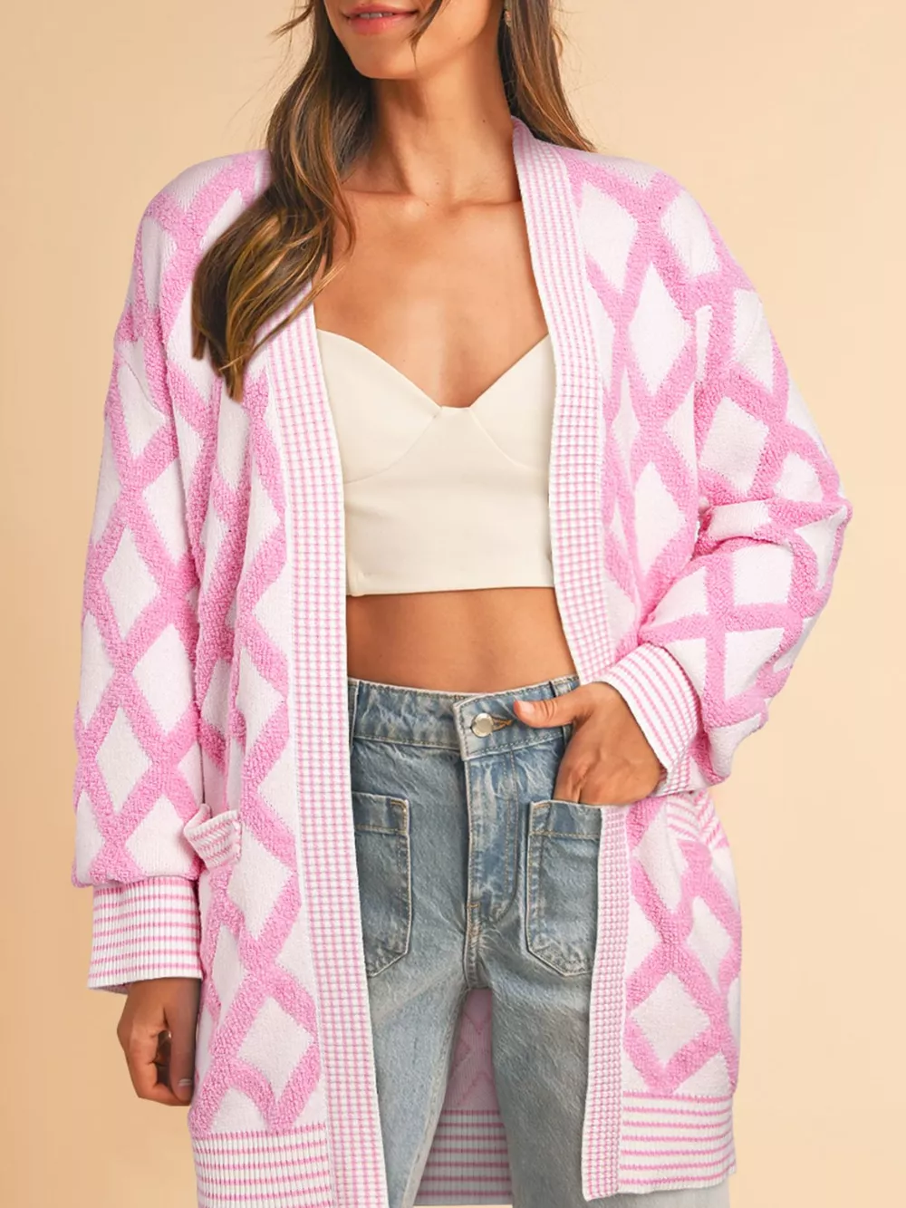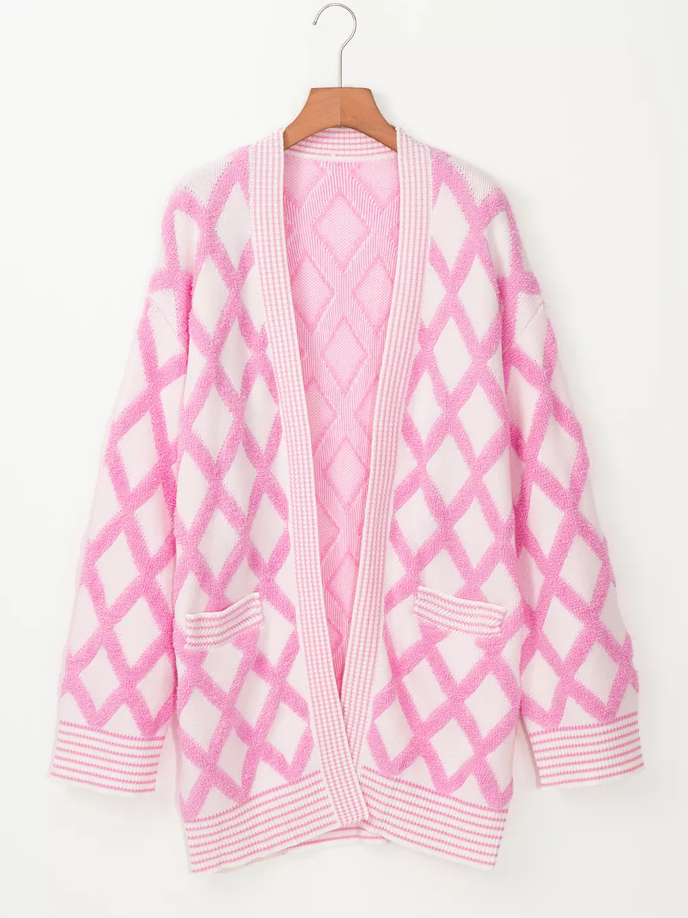 Rhombus Pattern Knit Open Front Pocketed Cardigans