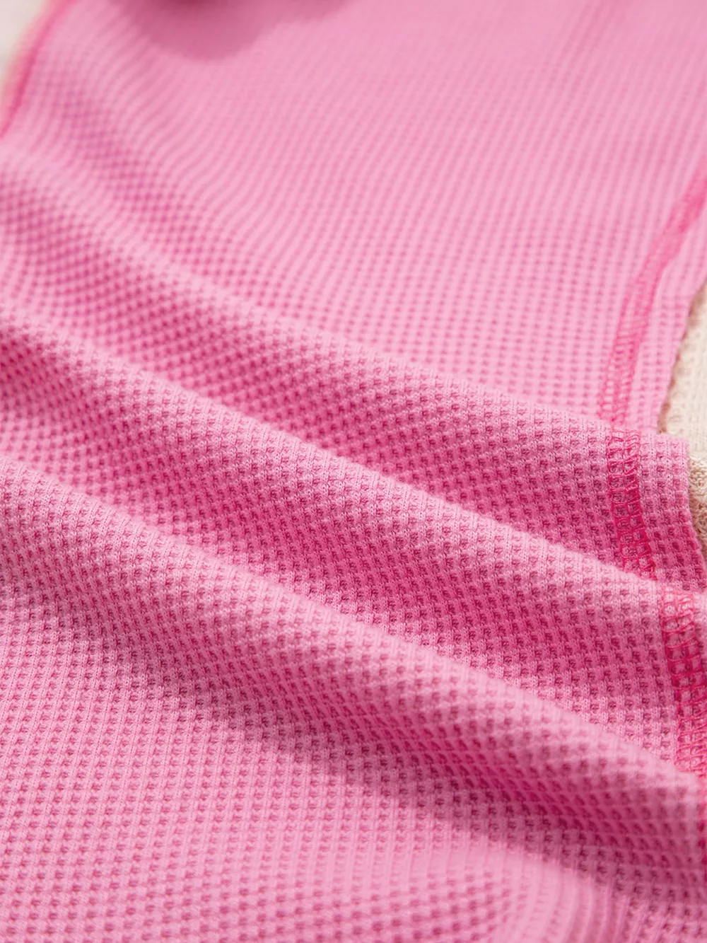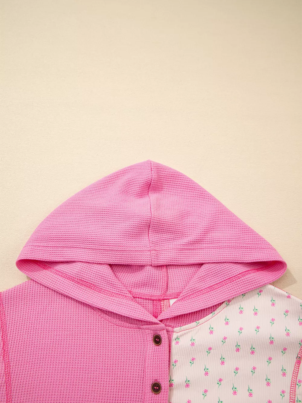 Mixed Texture Waffle Floral Patchwork Hooded Oversize Pullover