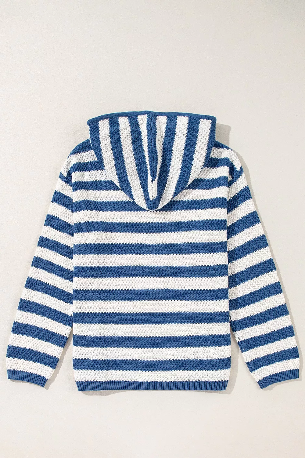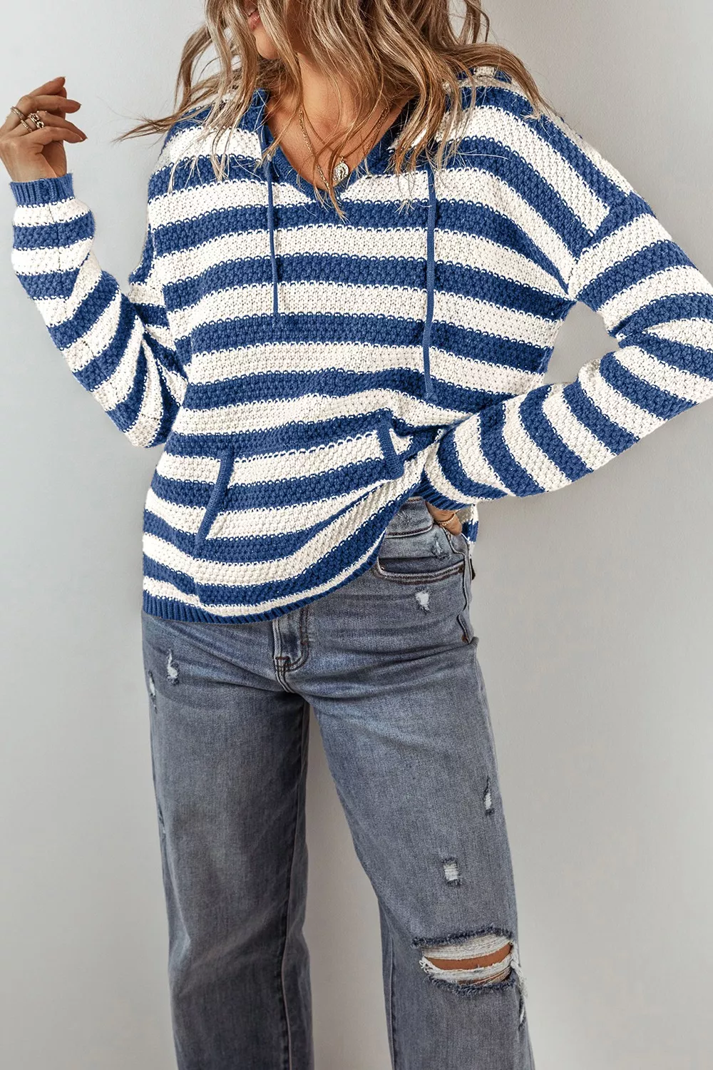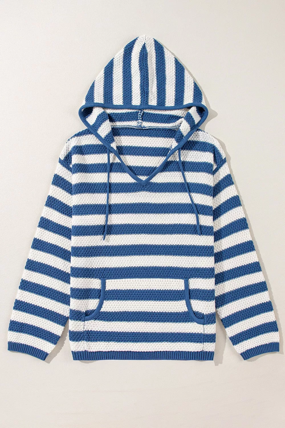 Stripe V Neck Pocketed Drawstring Hooded Sweater