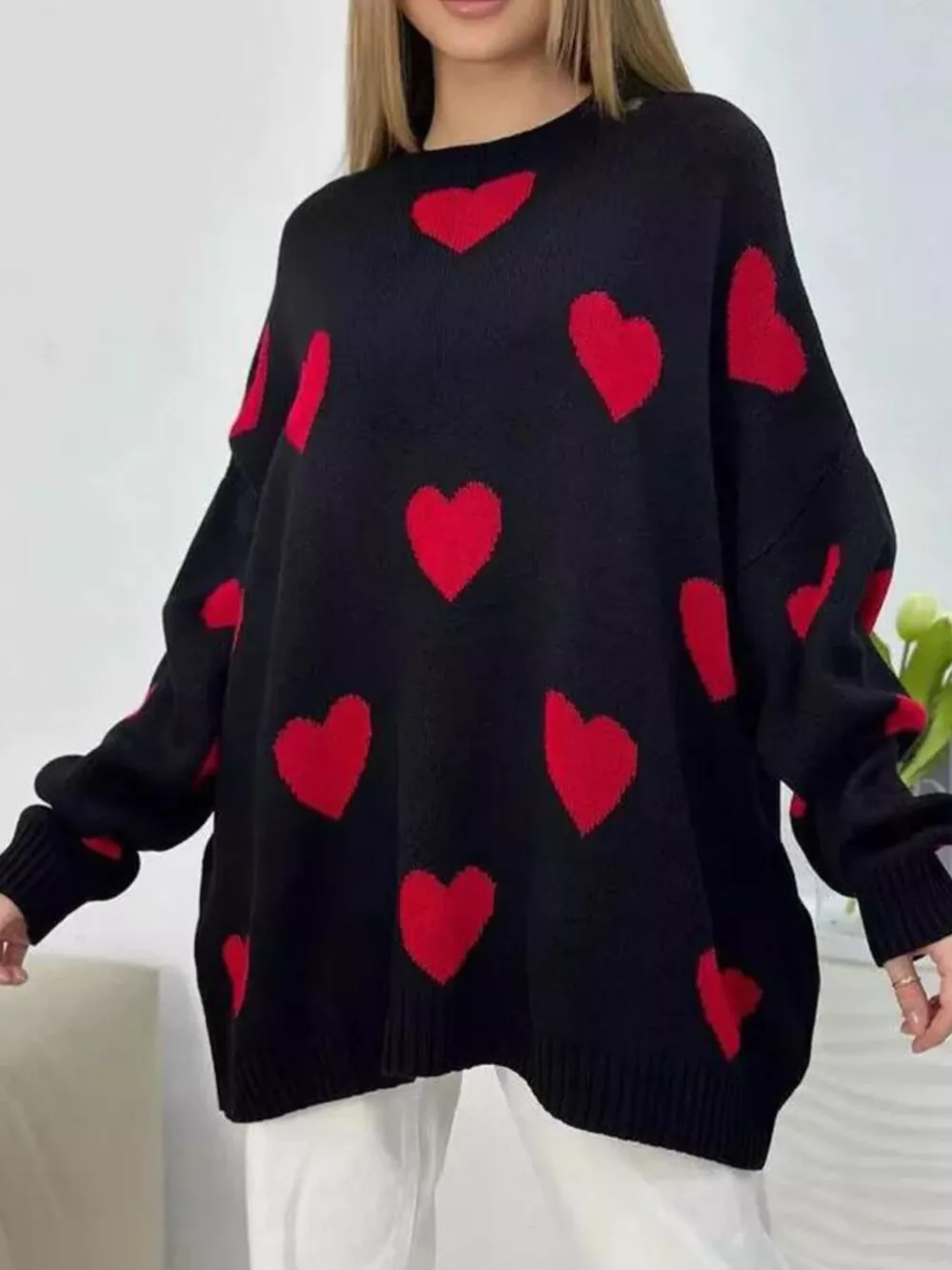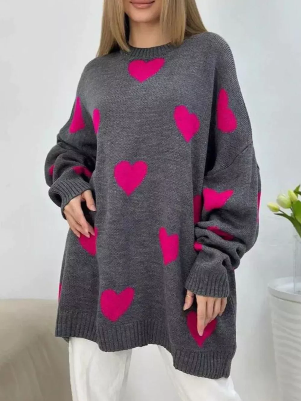 Heart Round Neck Oversized Knit Sweater