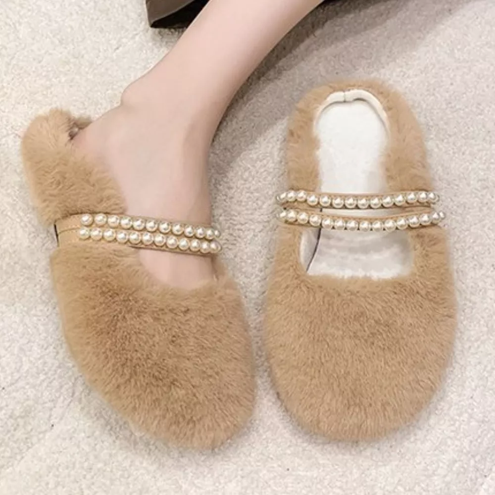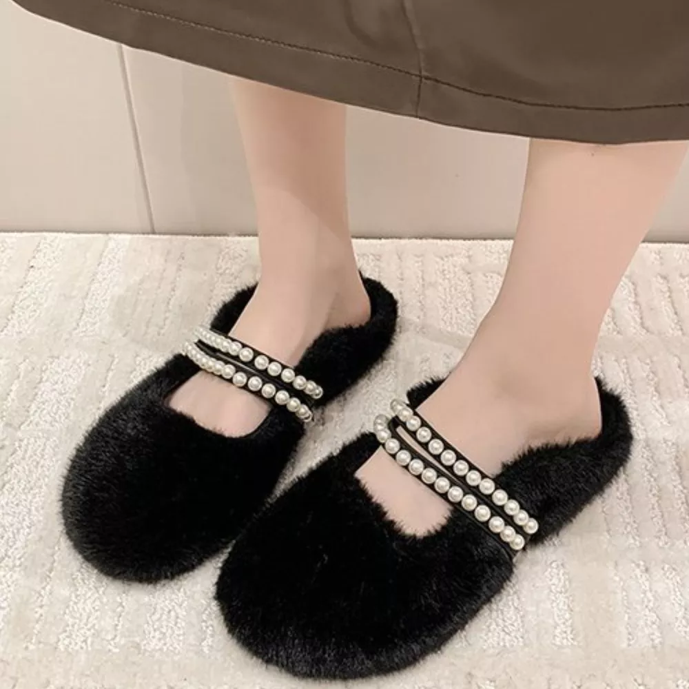 Pearl Embellished Plush Slippers