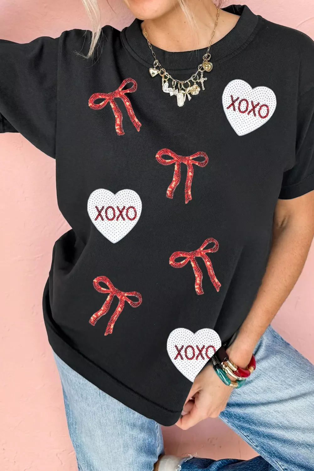 Valentines Bow XOXO Heart Sequin Patched Loose T Shirt