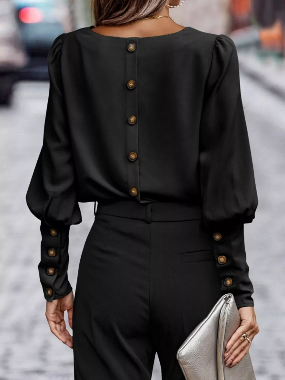 Back Button Lantern Sleeve Blouse