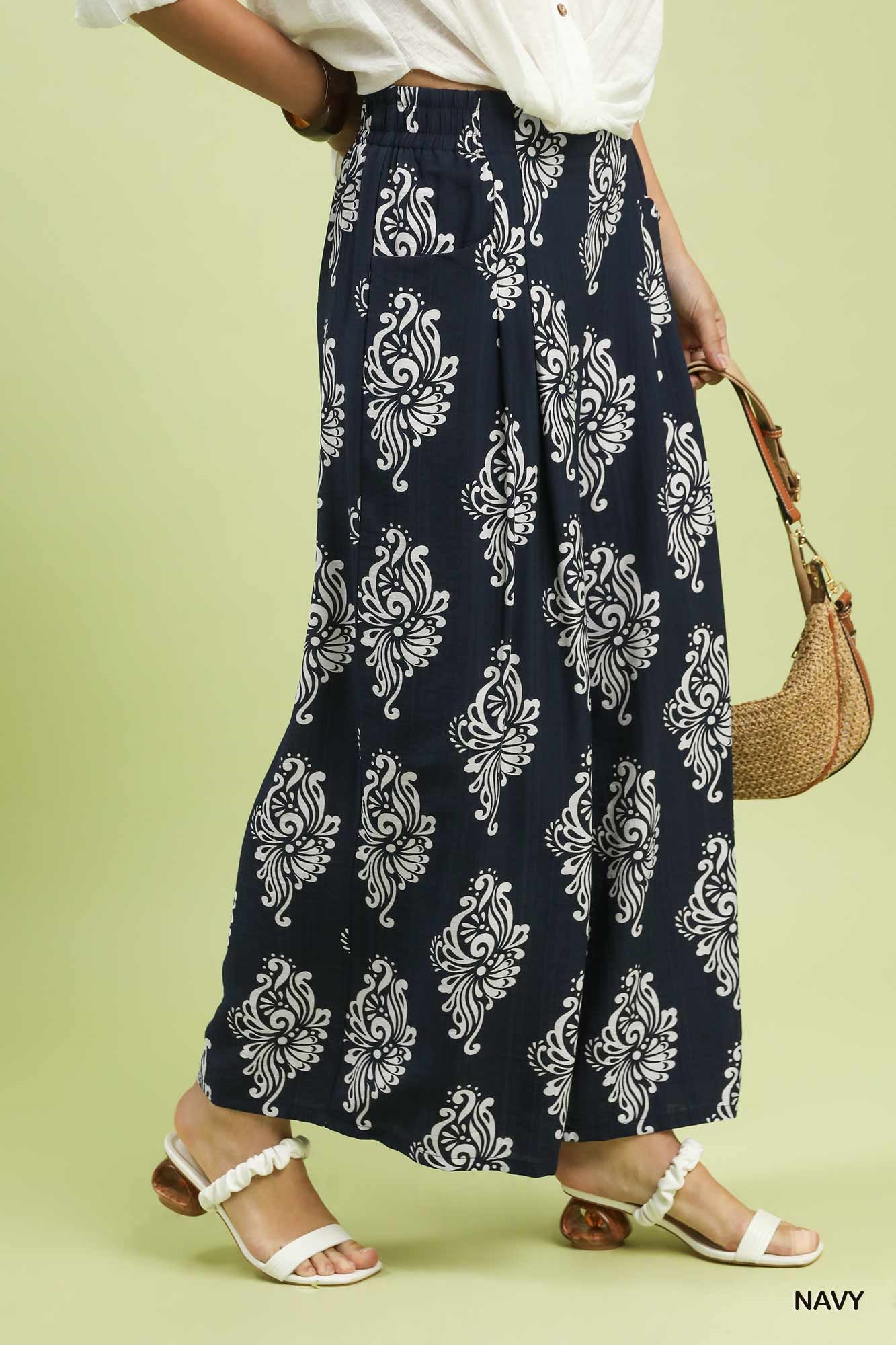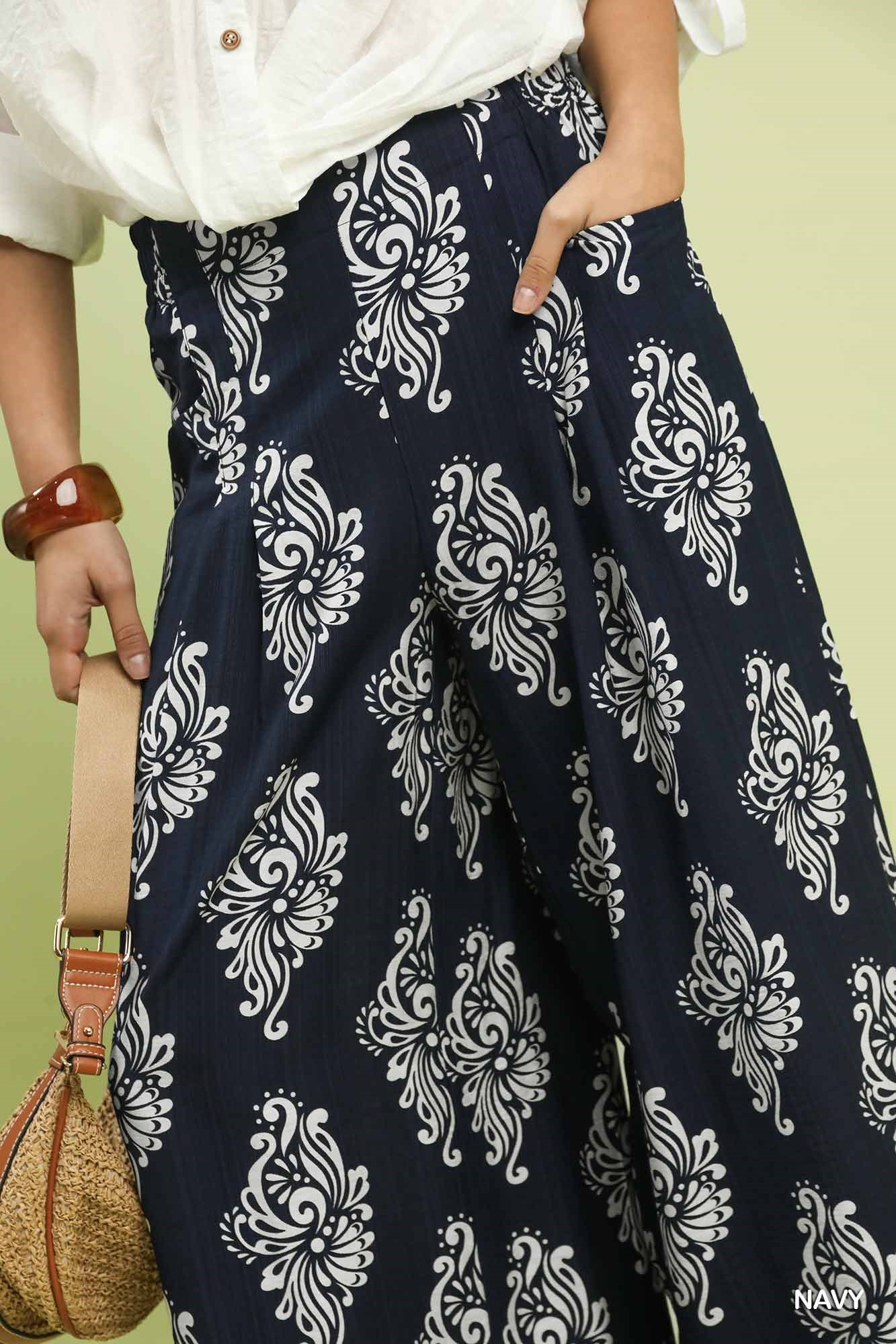 Make a statement with these abstract print wide leg pants featuring an elastic waistband for comfort and ease of wear. The wide leg silhouette offers a flowy and fashionable look that is perfect for any occasion. Convenient side pockets add functionality and style to the pants. The solid contrast trim adds a touch of sophistication to the overall design. Embrace comfort and style with these versatile and trendy pants that can be dressed up or down effortlessly.