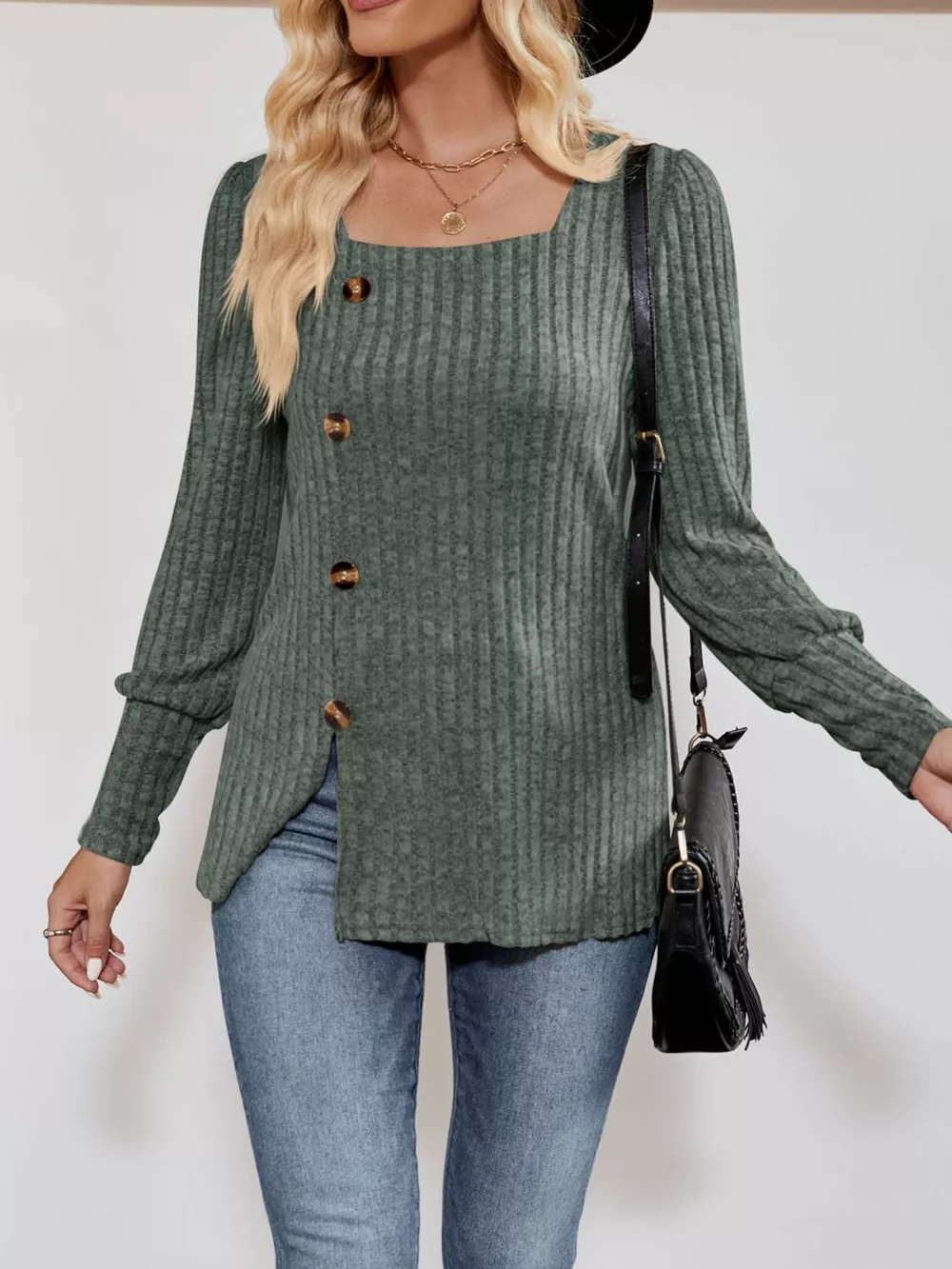 Ribbed Knit Slit Long Sleeve T-Shirt