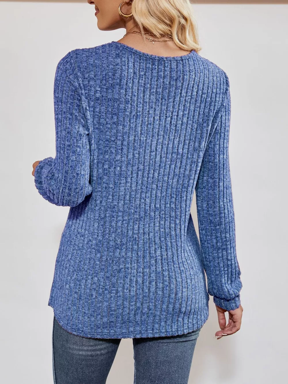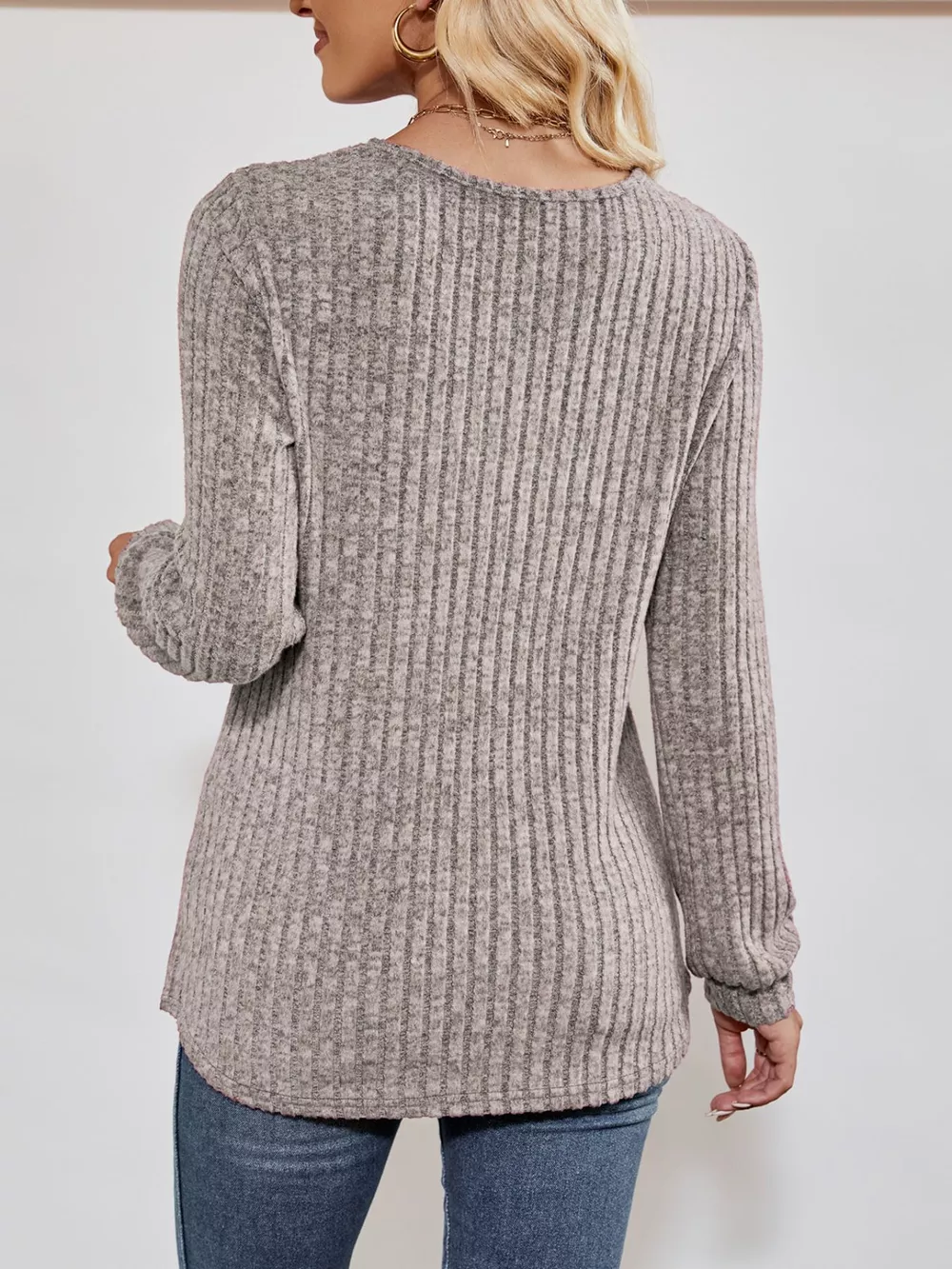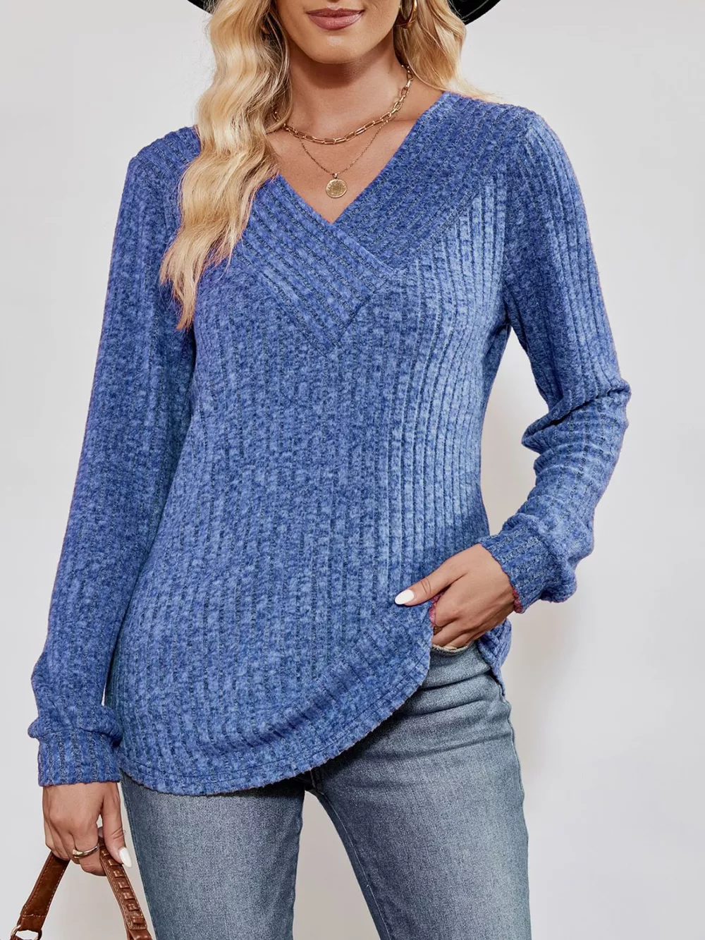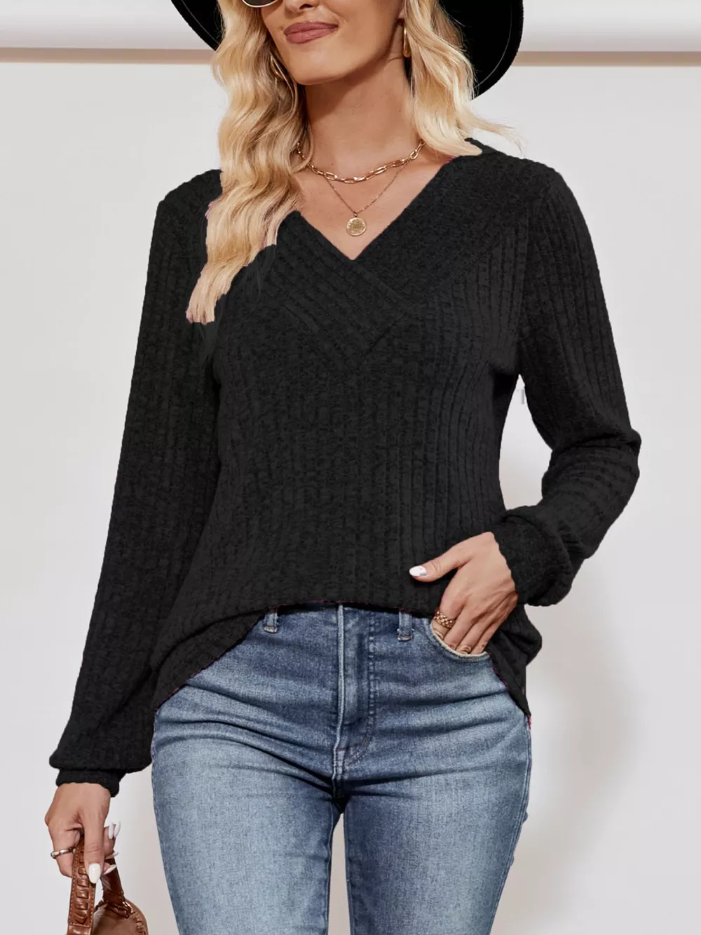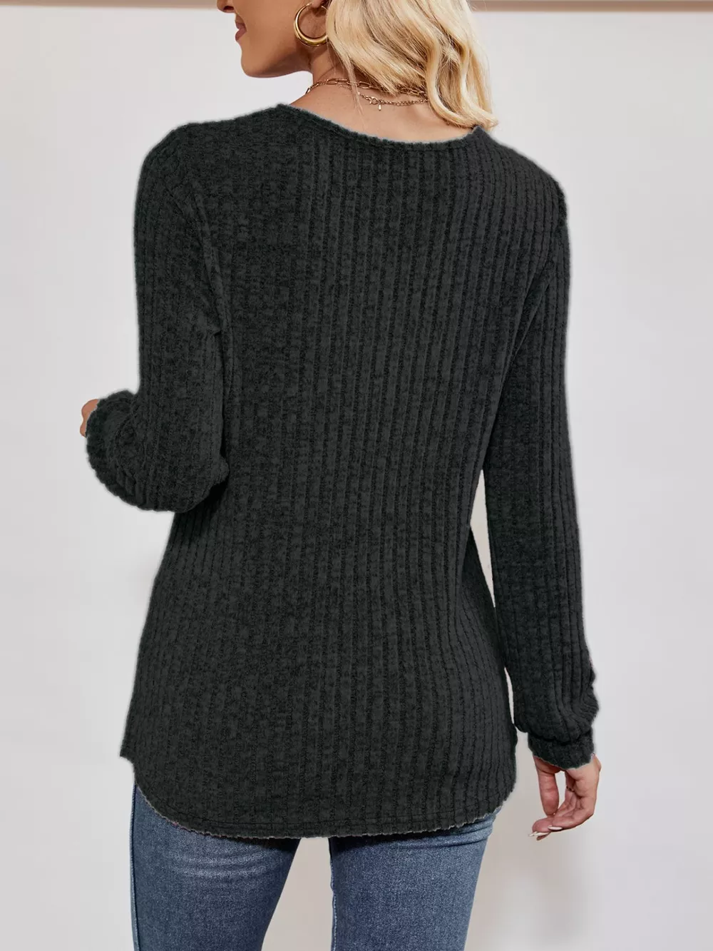 Ribbed Knit V-Neck Long Sleeve T-Shirt