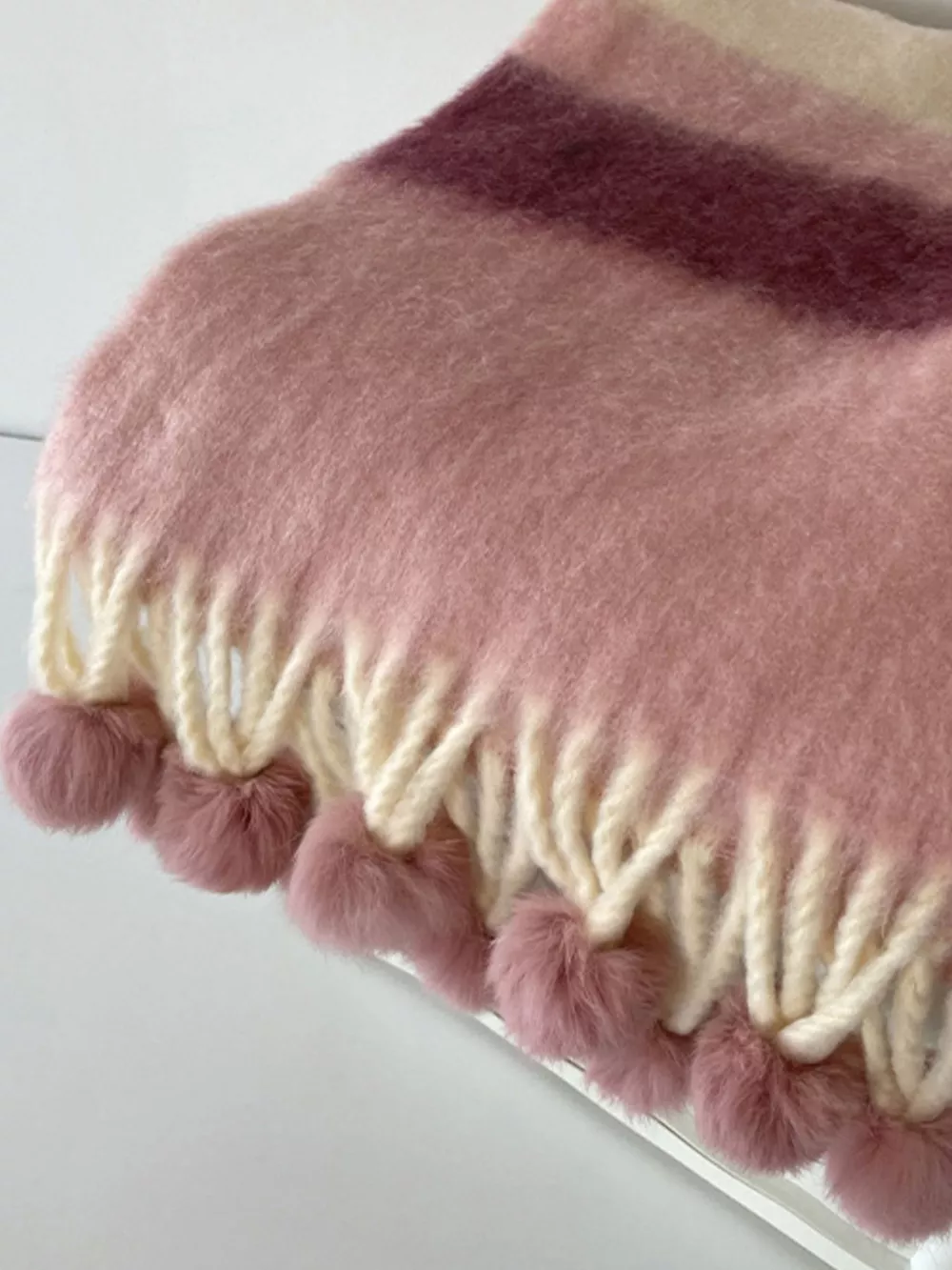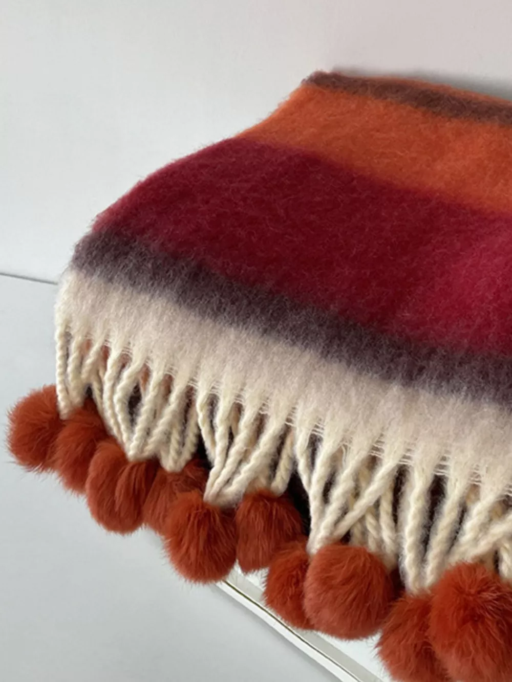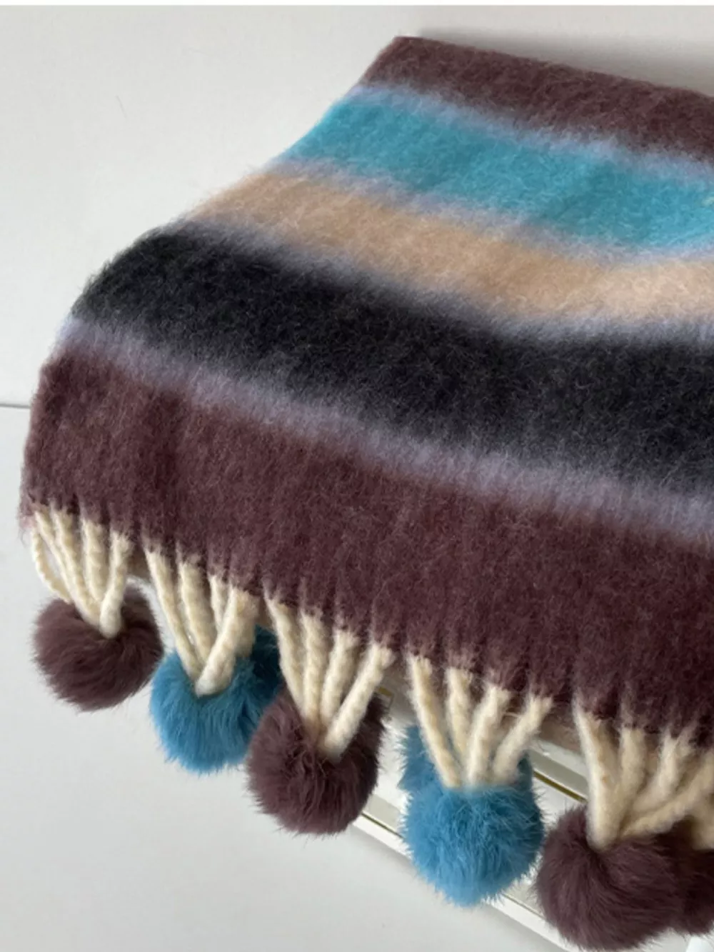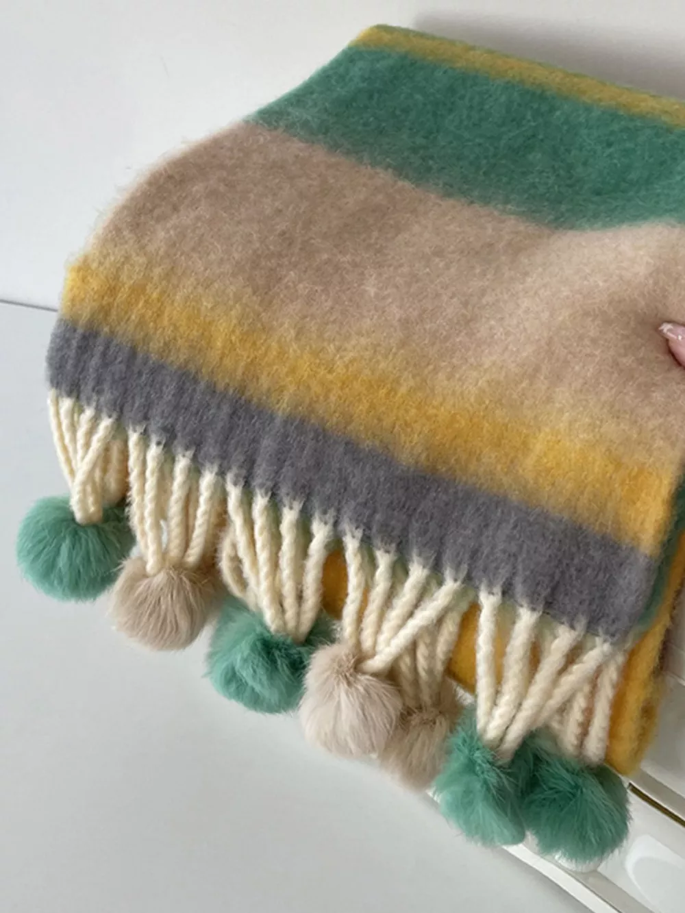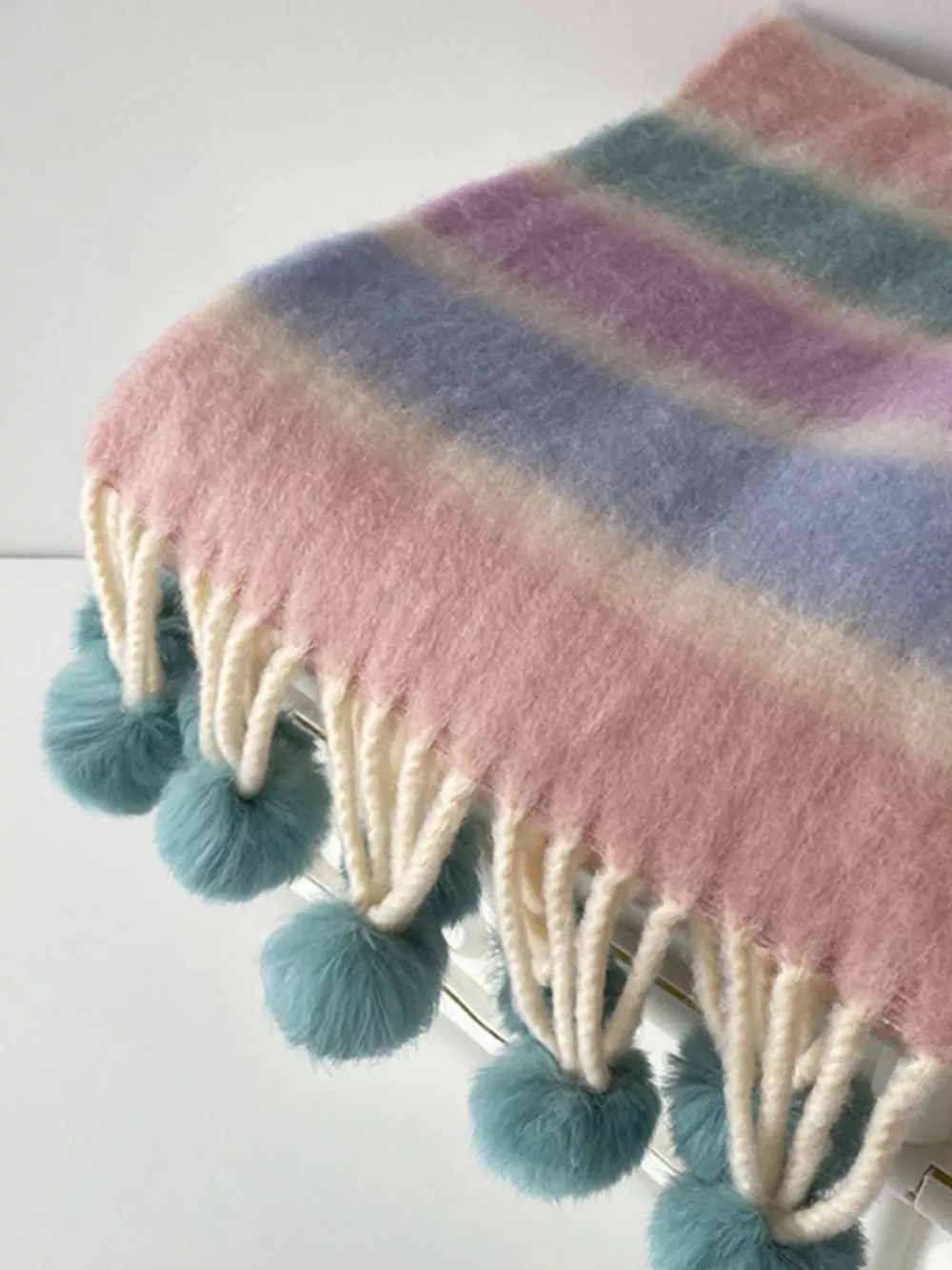 Rainbow Striped Fuzzy Scarf with Pom-Poms
